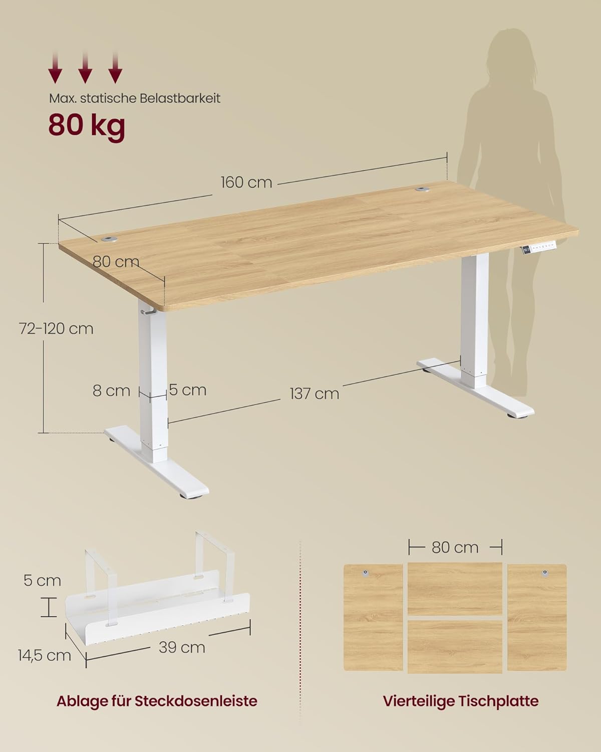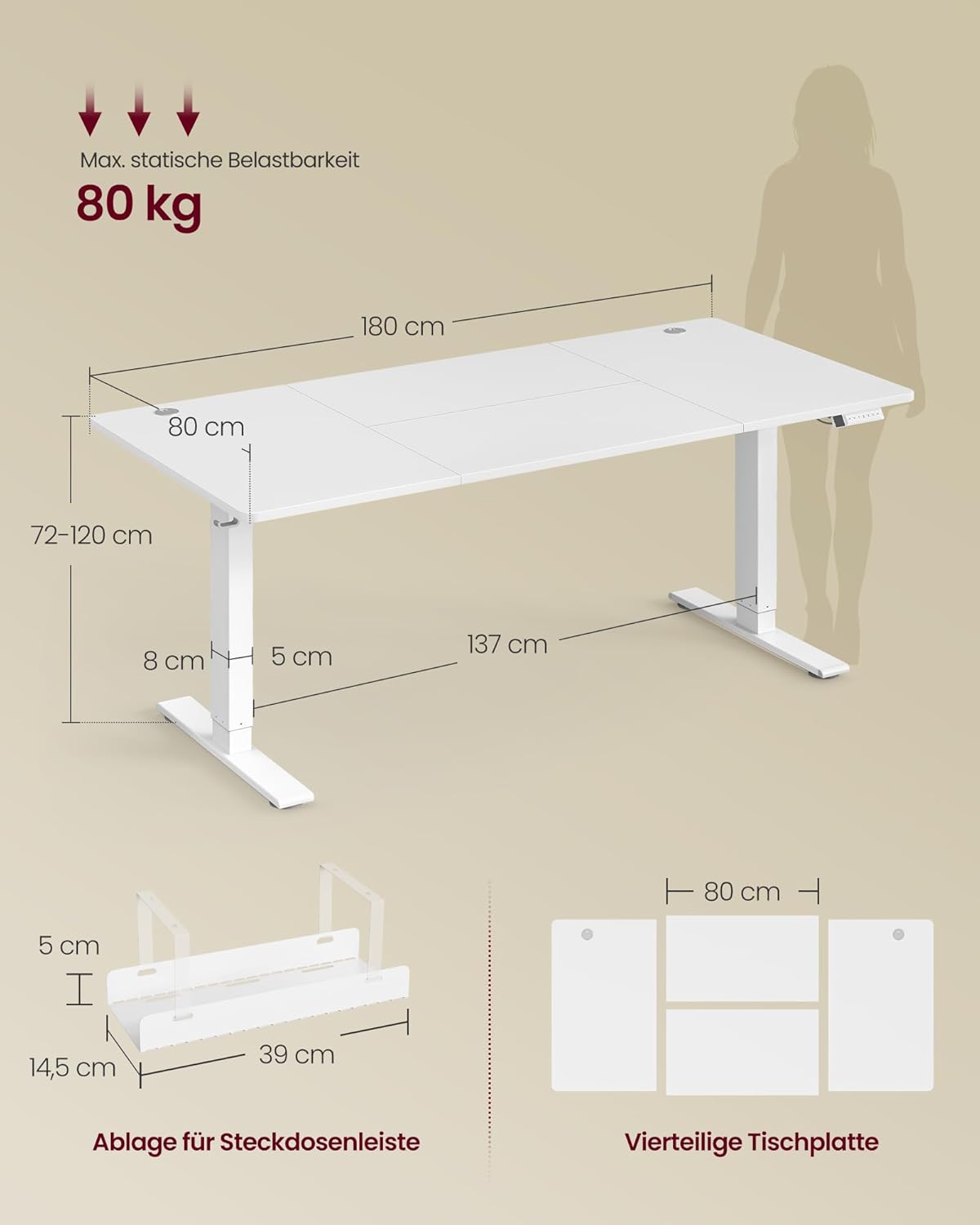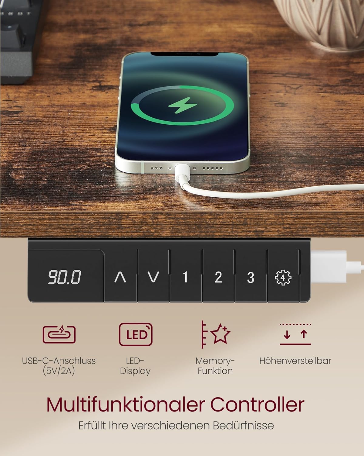 Elektrisch höhenverstellbarer Schreibtisch – 4 Speicherplätze – USB-C-Schnellladefunktion – 120 bis 180 x 80 cm