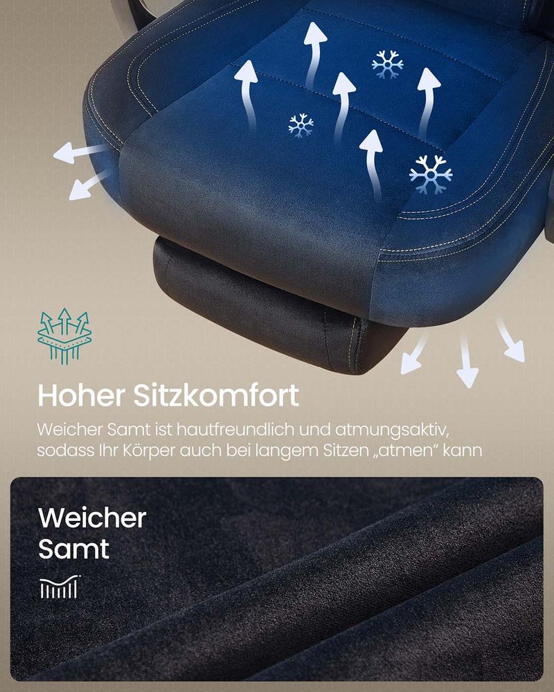 Die S-förmige Rückenlehne passt sich perfekt dem Körper an und bietet zusammen mit der verstellbaren Lenden- und Kopfstütze eine Rundum-Unterstützung. Dies reduziert Ermüdungserscheinungen und ist ideal für lange Arbeits- oder Gaming-Sessions.