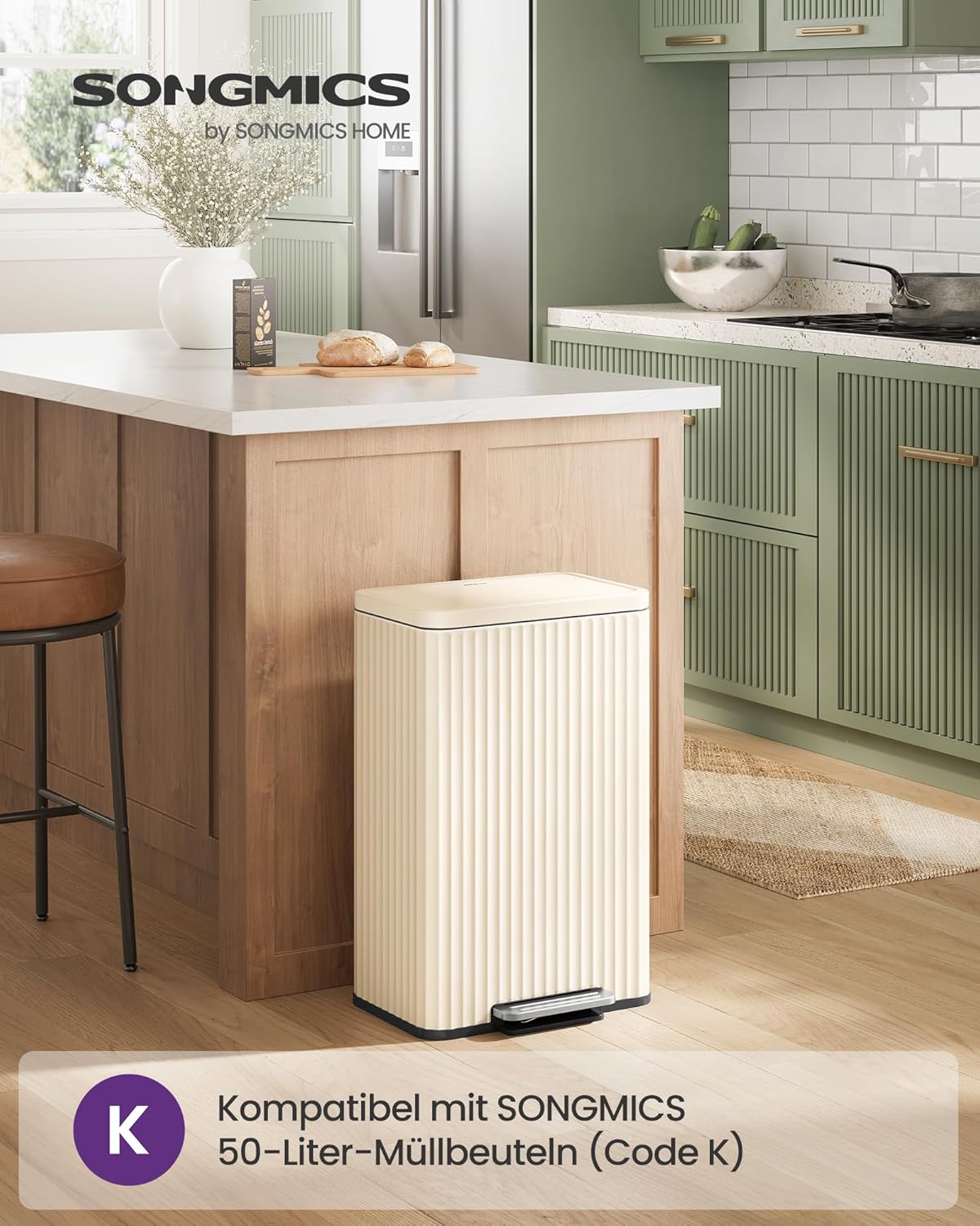 Dieser 50-Liter Küchenabfalleimer vereint praktische Funktionalität mit stilvollem Design. Die gerippte Textur verleiht dem Treteimer einen klassischen, zeitlosen Look, der sich nahtlos in moderne, rustikale oder industrielle Einrichtungen einfügt.