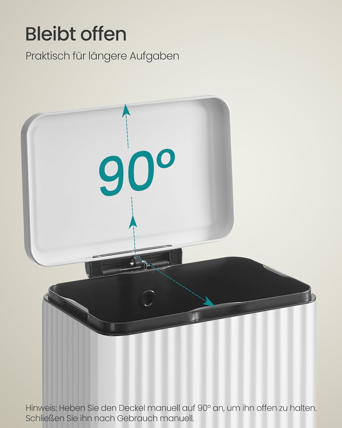 Der Treteimer lässt sich sanft mit dem Fußpedal öffnen und ermöglicht so eine freihändige Bedienung – ideal zum Kochen. Für längere Arbeiten kann der Deckel auch manuell um 90° geöffnet und offen gehalten werden. Dank des Soft-Close-Mechanismus schließt der Deckel langsam und leise, ohne lautes Knallen.