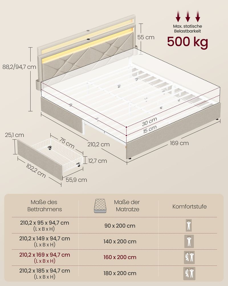 Robust, langlebig und verstellbar Der Rahmen ist mit Stahlquerträgern verstärkt und trägt bis zu 500 kg. Dank des verstellbaren Kopfteils (88,2 oder 94,7 cm) eignet sich das Bett für Matratzen mit einer Dicke von 15 bis 30 cm. Komfort, Stabilität und Langlebigkeit vereinen sich hier perfekt.