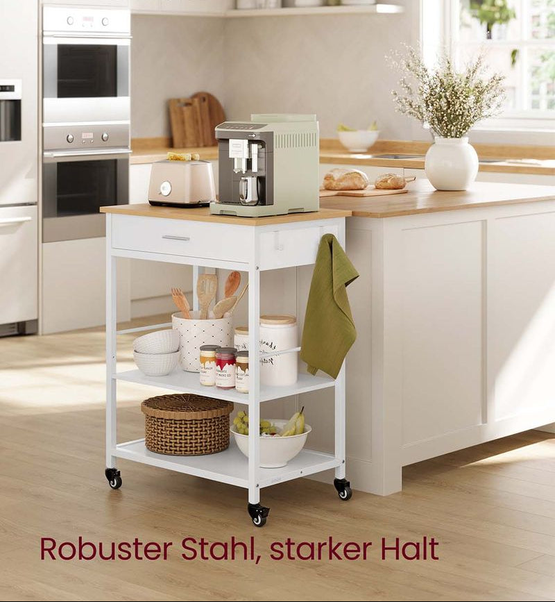 Mit seiner kompakten Größe bietet dieser Küchenwagen zusätzliche Arbeits- und Ablagefläche, ohne viel Platz einzunehmen. Ideal für kleinere Küchen, Wohnungen oder Studios.