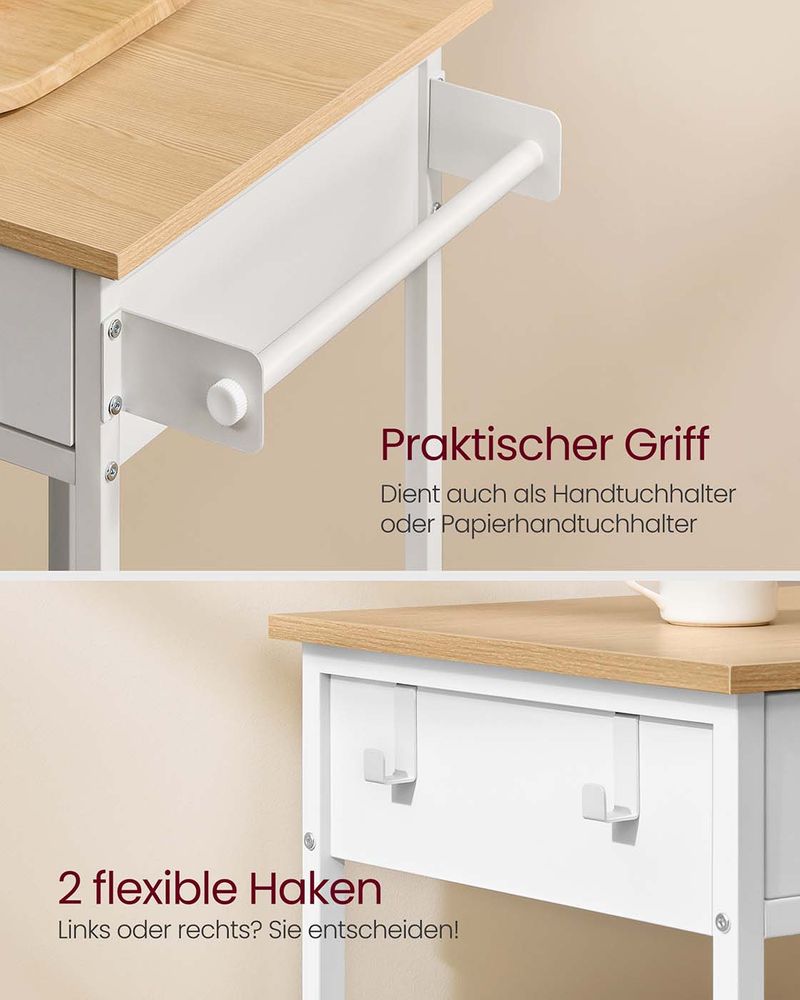 Mobiler Küchenwagen mit Schublade und Ablagen – Beweglich und abschließbar – Ideal für kleine Küchen – Modernes Eichen-Weiß-Finish