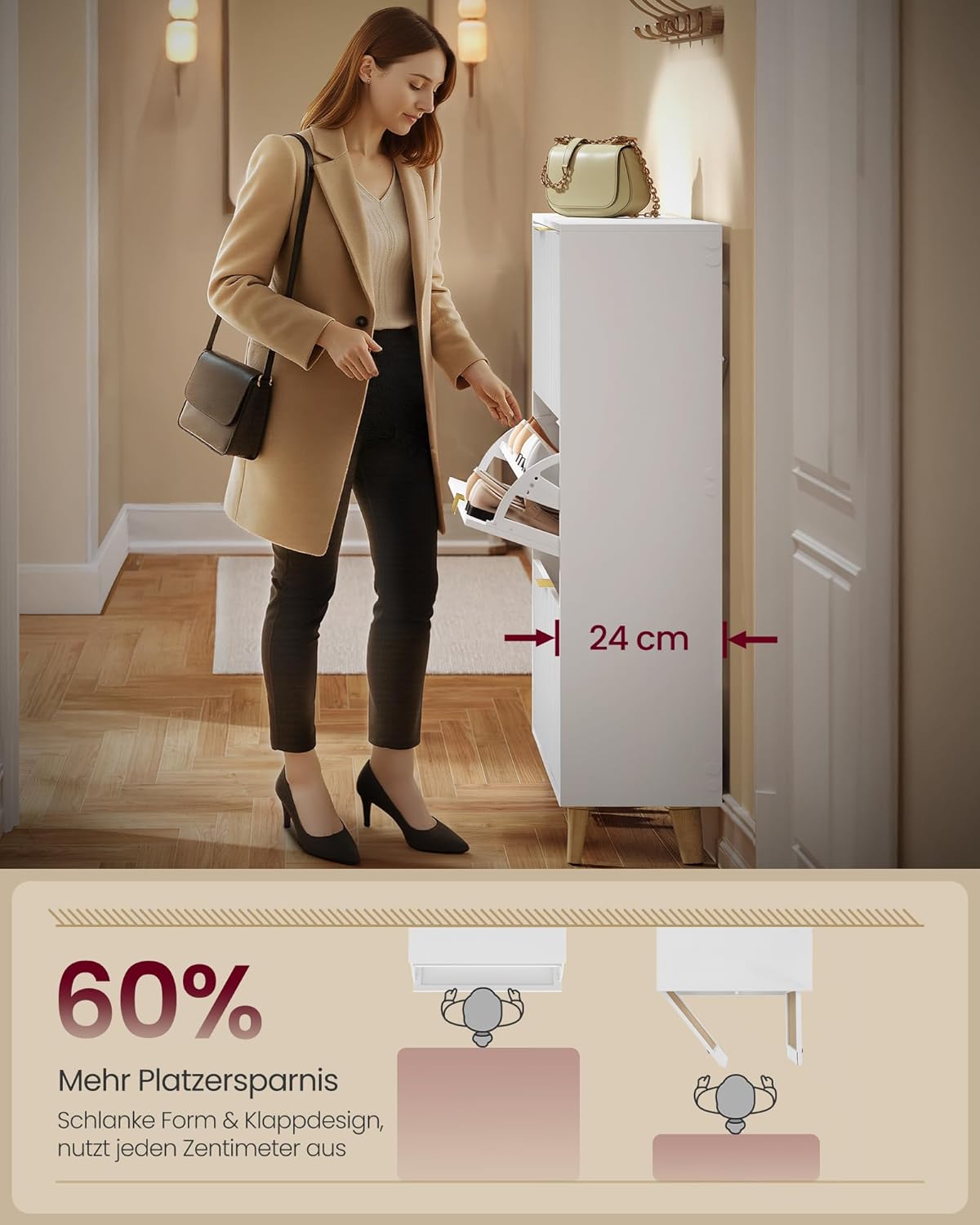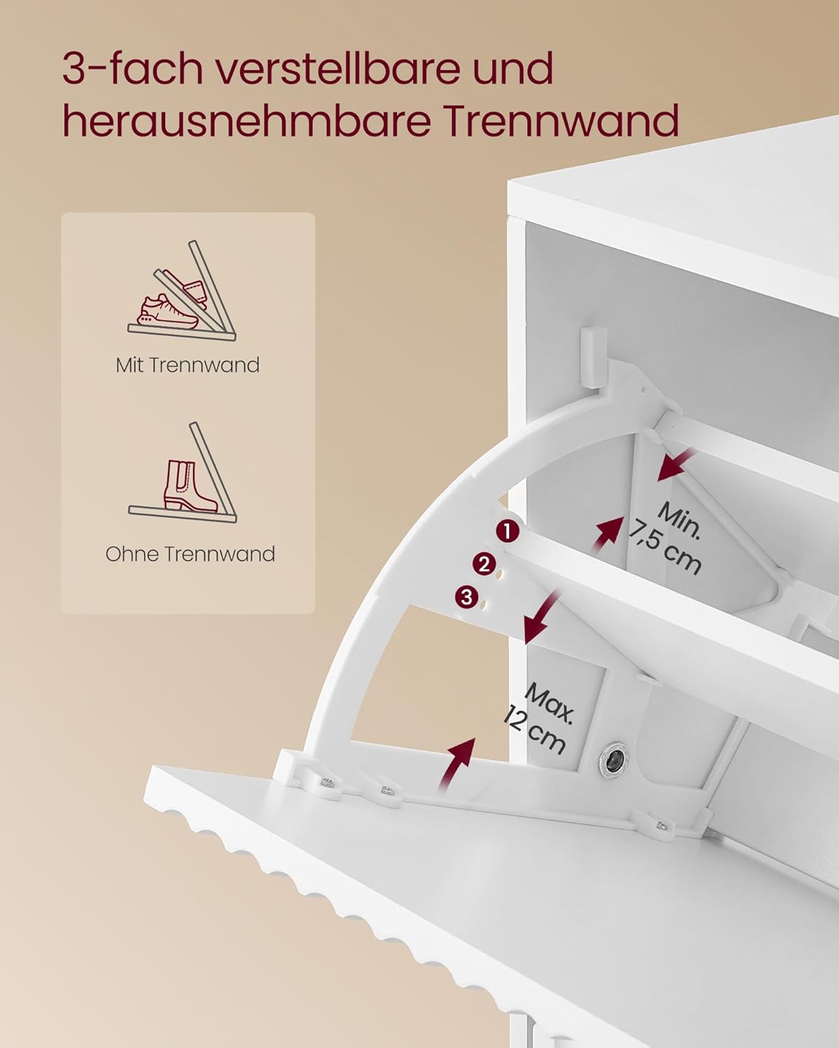 Der Schuhschrank wird mit gekennzeichneten Teilen und einer klaren Schritt-für-Schritt-Anleitung geliefert, sodass die Montage schnell und unkompliziert ist. Sie können Ihrem Interieur im Handumdrehen ein stilvolles und funktionales Möbelstück hinzufügen.
