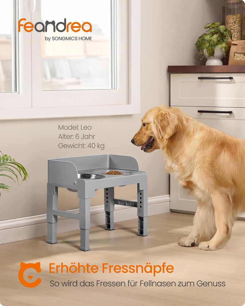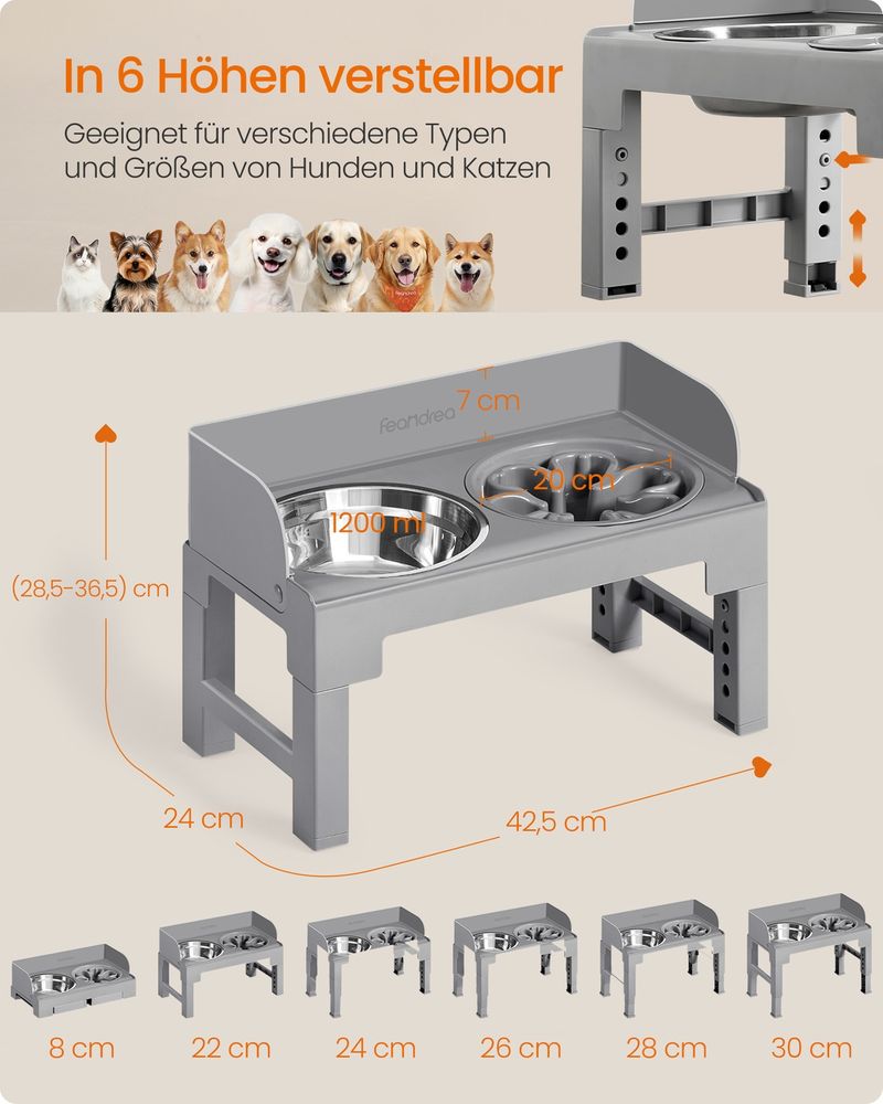Die Höhe des Futternapfs ist auf 8, 22, 24, 26, 28 und 30 cm verstellbar und somit ideal für Hunde und Katzen unterschiedlicher Größe. Dies gewährleistet eine bequeme und gesunde Fressposition, die den Druck auf den Nacken reduziert.