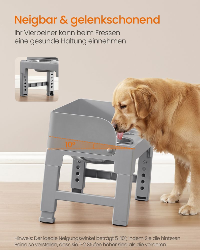 Der Futterständer hat einen empfohlenen Neigungswinkel von 5–10°, der durch eine um ein bis zwei Stufen höhere Positionierung der hinteren Beine im Vergleich zu den vorderen erreicht wird. Dies reduziert den Druck auf die Gelenke und macht das Fressen für Ihr Haustier angenehmer.