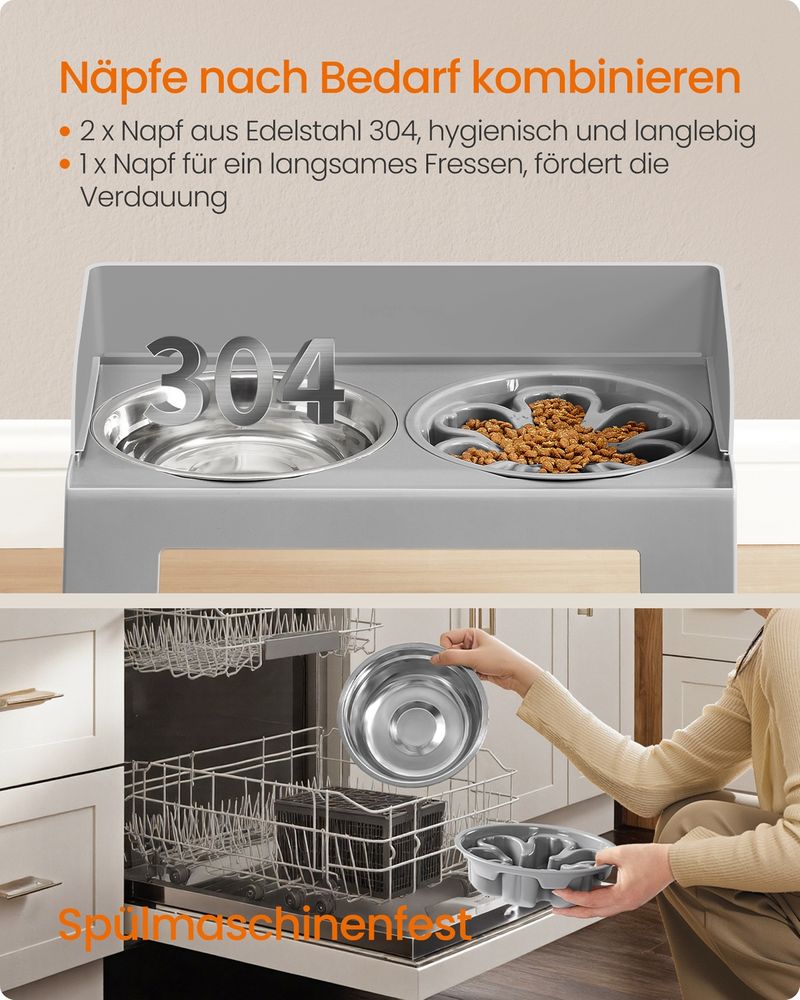 Im Lieferumfang enthalten sind 2 Edelstahlnäpfe (Edelstahl 304) – hygienisch und langlebig – und 1 Anti-Fress-Napf, der Überfressen vorbeugt und die Verdauung fördert. Alle Näpfe sind spülmaschinenfest.