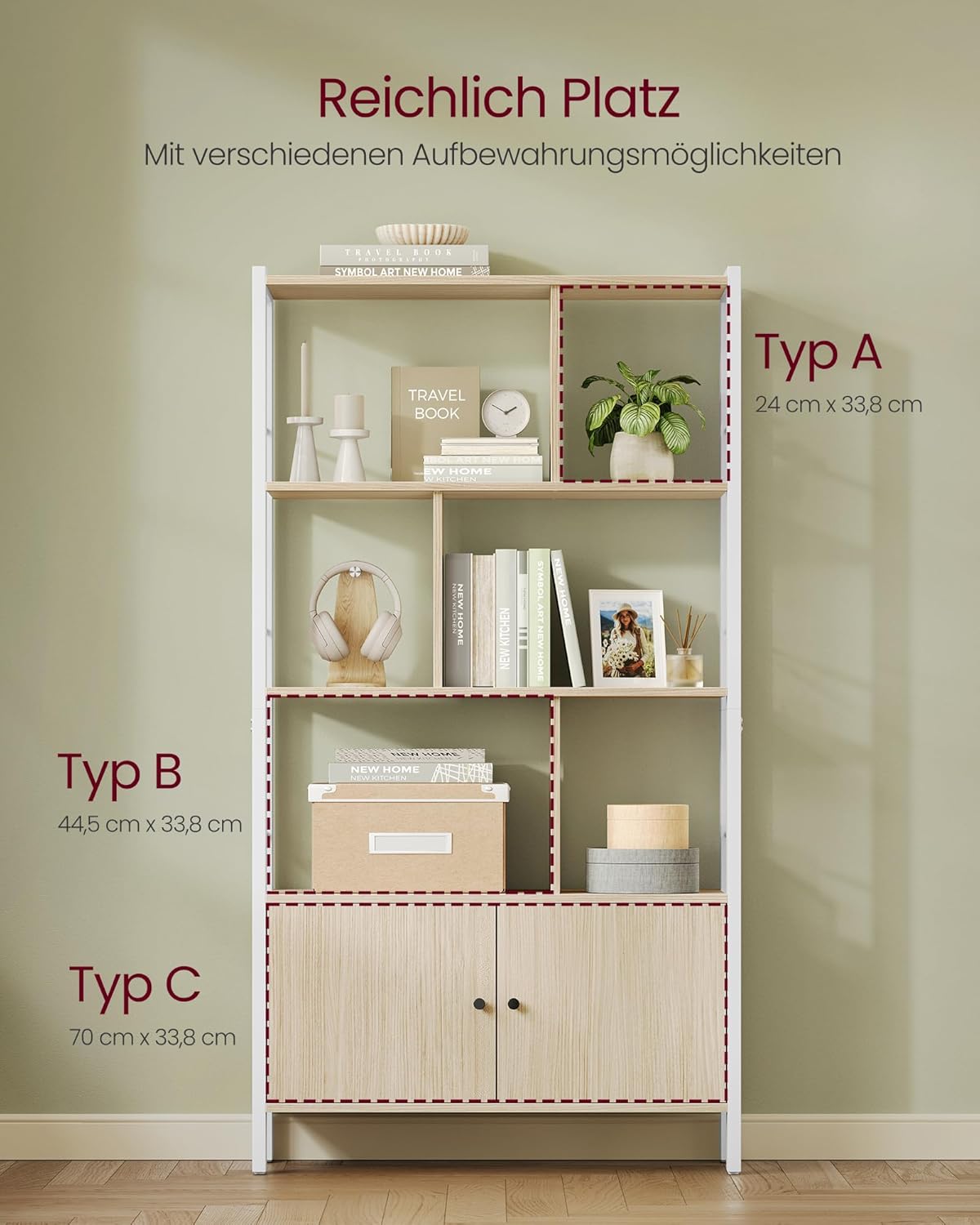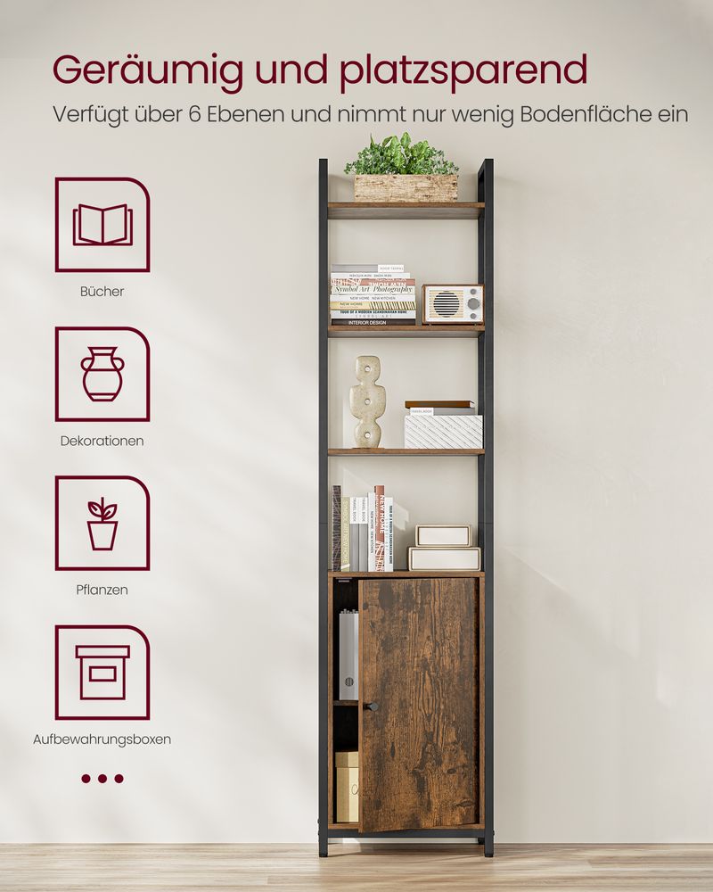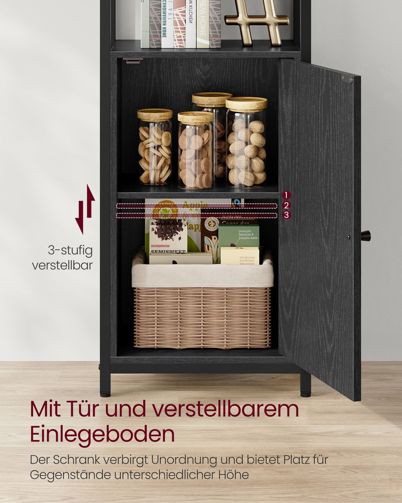 Bücherregal mit Schrank und offenen Fächern – Schmaler Aufbewahrungsschrank – Verstellbare Einlegeböden – MDF & Spanplatte