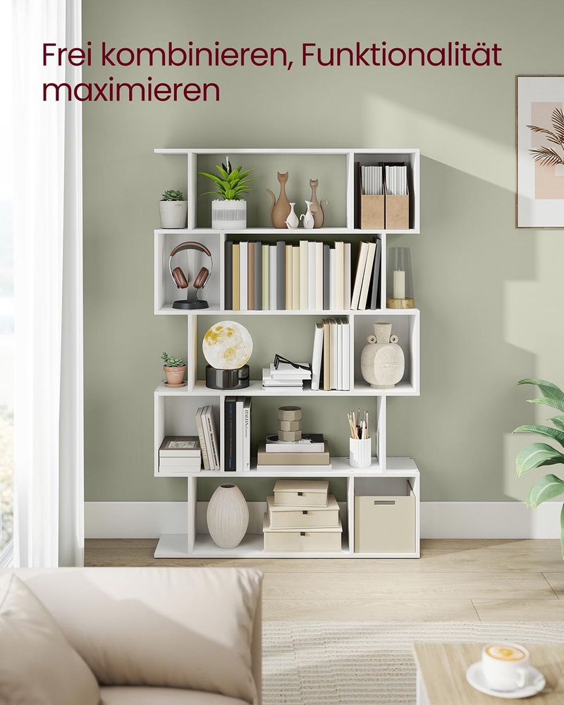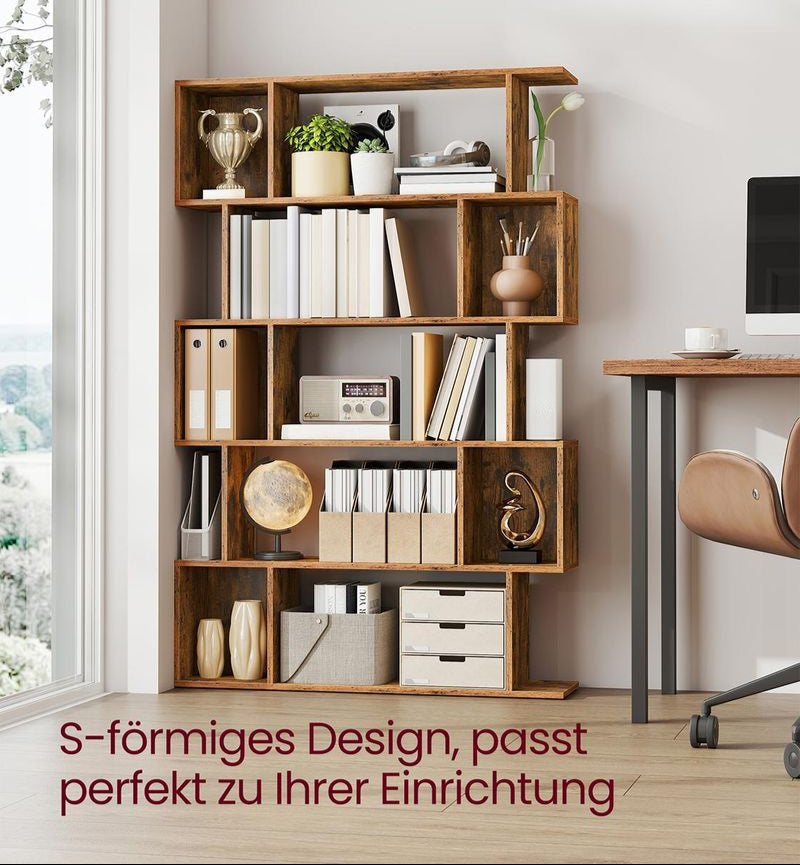 Bücherregal – S-förmiges Design – 5 Ebenen – 90 cm breit – 30 kg Tragkraft pro Ebene
