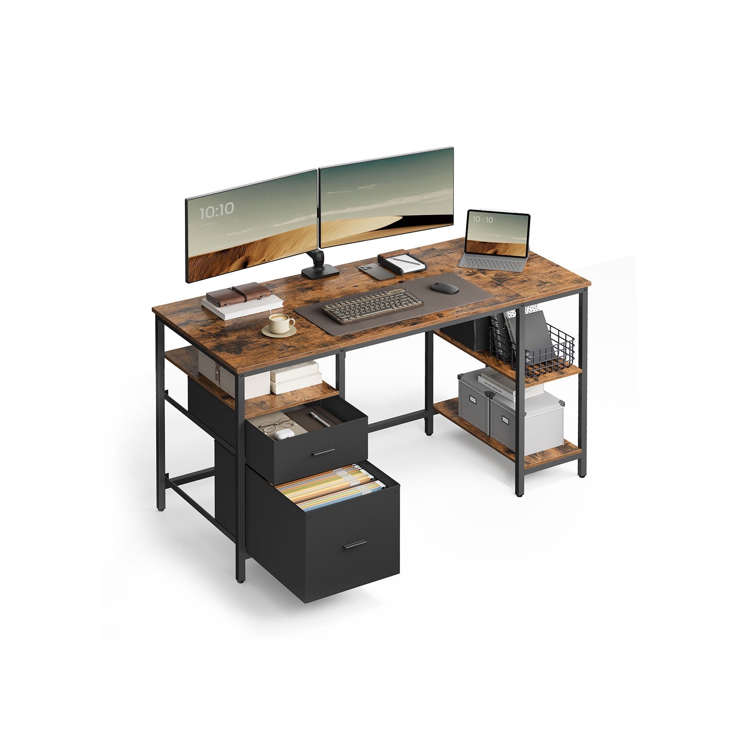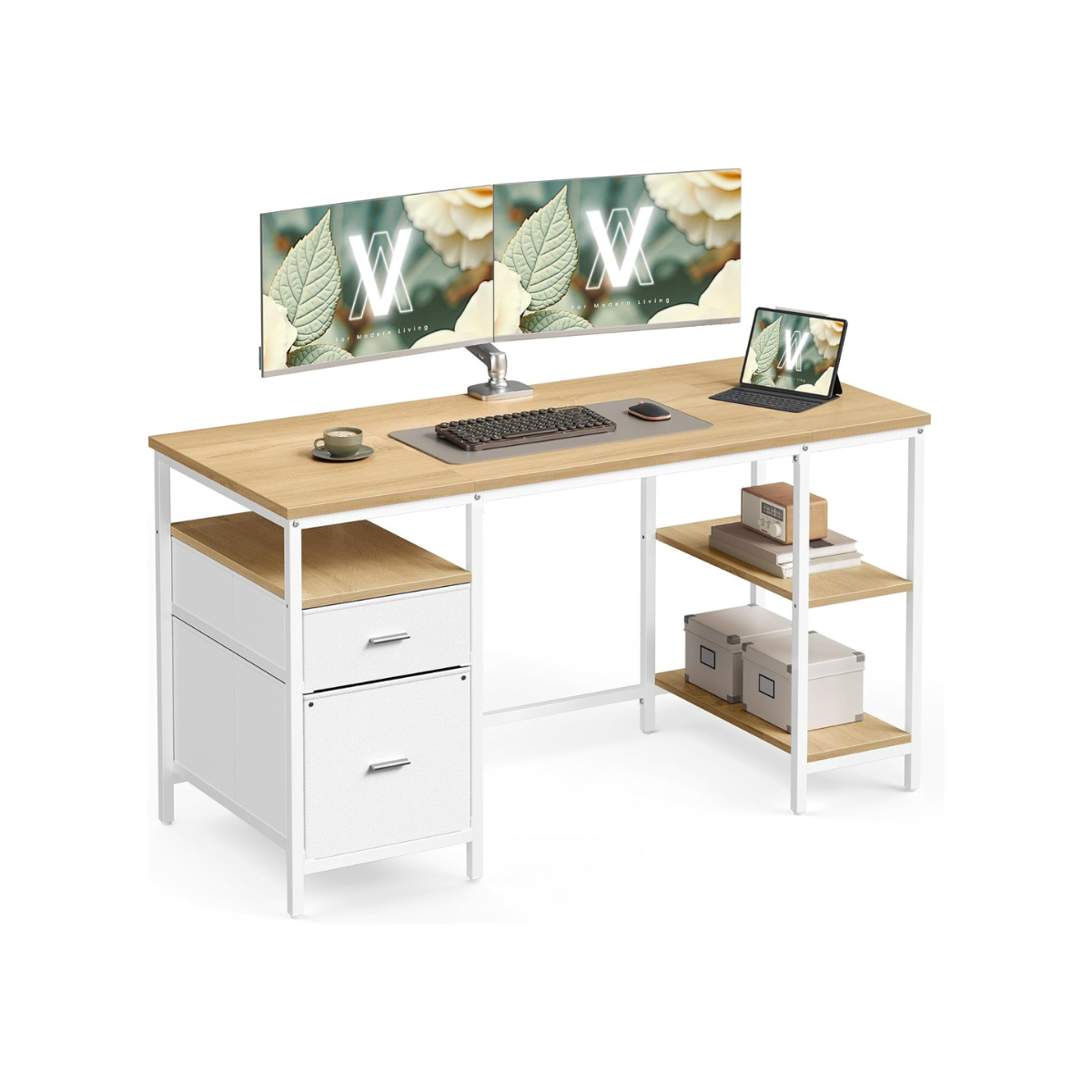 Die großzügige Tischplatte (60 x 140 oder 60 x 160 cm) bietet ausreichend Platz für Ihren Laptop, Ihre Dokumente und Dekorationsgegenstände. Eine kleine Schublade sorgt für Ordnung in Stiften und Notizblöcken, während die große Schublade und drei offene Regale (eines davon herausnehmbar) zusätzlichen Stauraum für Dokumente, Geräte oder sogar einen Computerturm bieten.