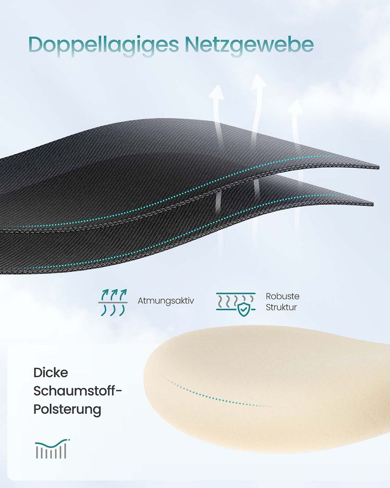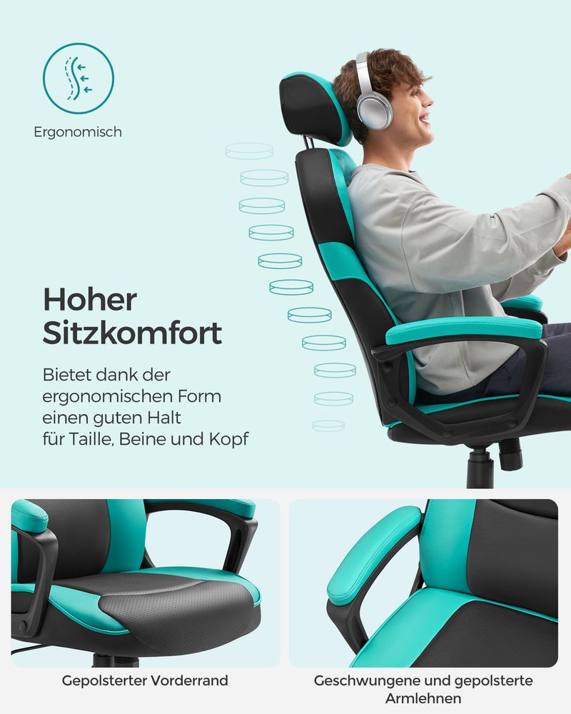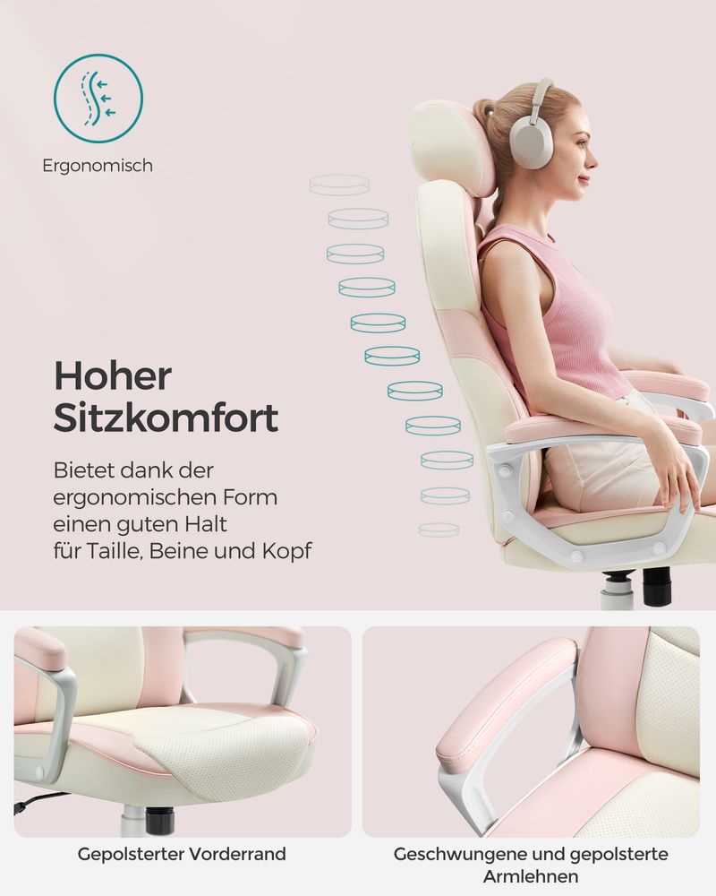 Die gepolsterte Rückenlehne unterstützt die natürliche Krümmung der Wirbelsäule, während das weiche Sitzkissen den Druck auf Rücken und Beine reduziert. Die geschwungene Kopfstütze bietet zusätzliche Nackenstütze, und die gepolsterten Armlehnen entlasten Schultern und Arme.