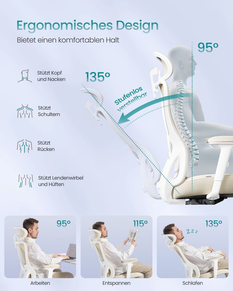 Die S-förmige Rückenlehne passt sich perfekt der natürlichen Krümmung Ihres Rückens an und ist zwischen 95° und 135° verstellbar. Ob Sie arbeiten, entspannen oder eine Pause machen – Sie finden immer die ideale Sitzposition.