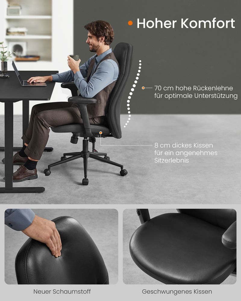 Die 70 cm hohe Rückenlehne folgt der natürlichen Krümmung Ihrer Wirbelsäule und bietet optimalen Halt. Die geschwungene Sitzfläche mit 8 cm dicker Schaumstoffpolsterung entlastet Ihre Hüften. Die verstellbaren Armlehnen erhöhen den Komfort an langen Arbeitstagen.