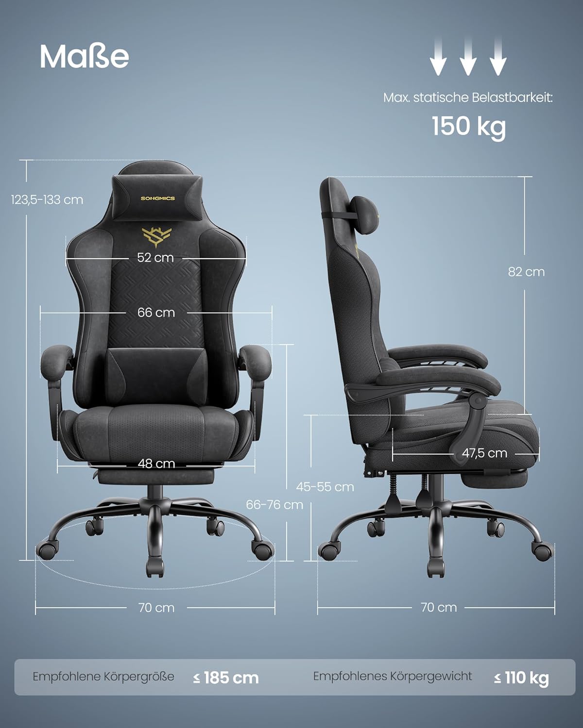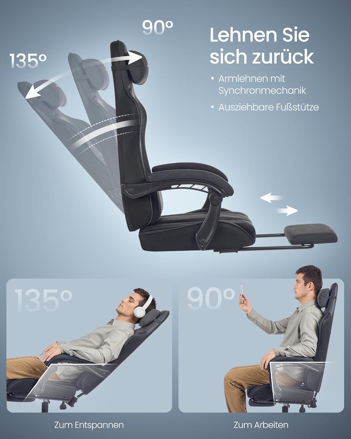 Die Rückenlehne ist zwischen 90° und 135° verstellbar, die Armlehnen sind synchron verstellbar, und der Stuhl ist mit einem weichen Schaumstoff-Kopf- und Lendenkissen ausgestattet. Die ausziehbare Fußstütze bietet zusätzliche Entspannung.