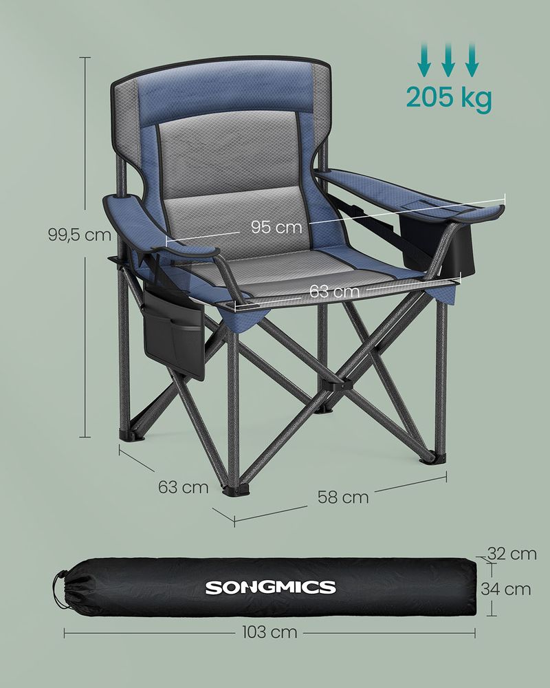 Campingstuhl mit Getränkehalter – 99,5 cm hoch – gepolsterte Sitzfläche – 205 kg Tragkraft – faltbar – 63 x 95 cm