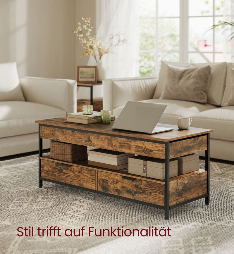 Couchtisch mit Hubfunktion – Moderner Couchtisch mit verstellbarer Tischplatte – Versteckter Stauraum & Schubladen – 100 cm – Holz & Stahl