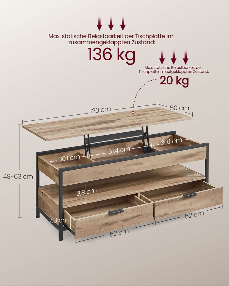 Verstellbarer Couchtisch im Industriestil mit anhebbarer Platte – 120 x 50 cm – Mit Schubladen und verstecktem Stauraum