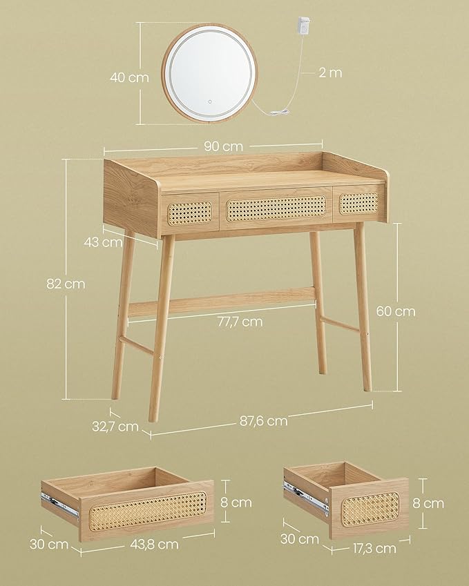 Mit drei geräumigen Schubladen bietet dieser Frisiertisch reichlich Platz für Make-up, Hautpflege, Schmuck und Accessoires. So bleibt Ihr Kosmetikbereich organisiert, stilvoll und immer einsatzbereit.