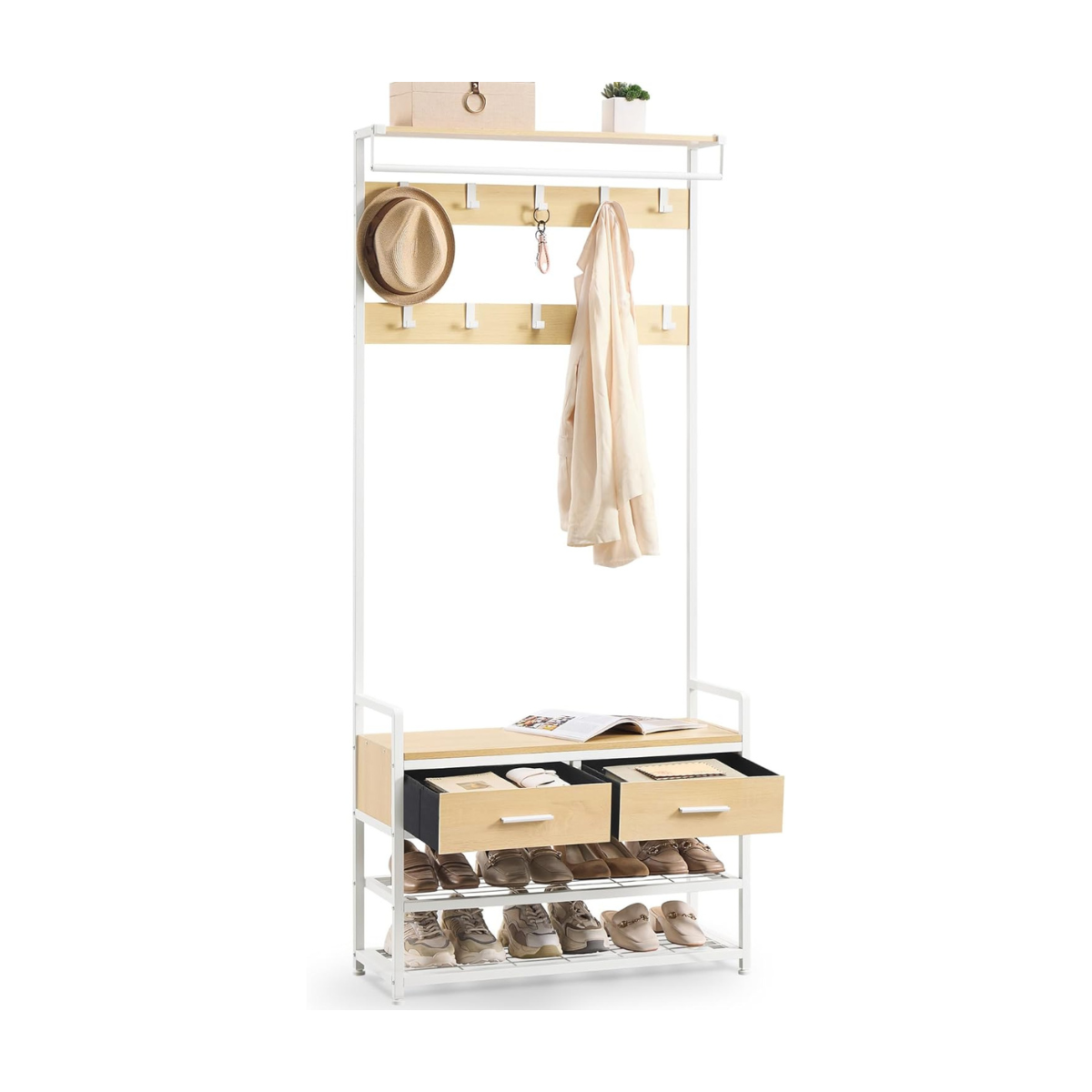 Garderobenständer mit Bank – 3-in-1-Kleiderständer – 9 Haken, 2 Ablagen und Bank