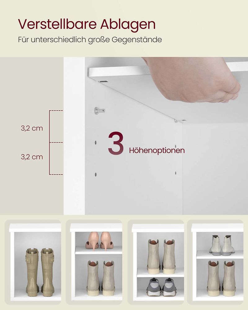 Ob Sneaker, High Heels oder Aufbewahrungskörbe – dank der verstellbaren Regalböden passt alles problemlos in diese Schuhbank. Kein lästiges Hin- und Herschieben mehr, um Platz zu schaffen.
