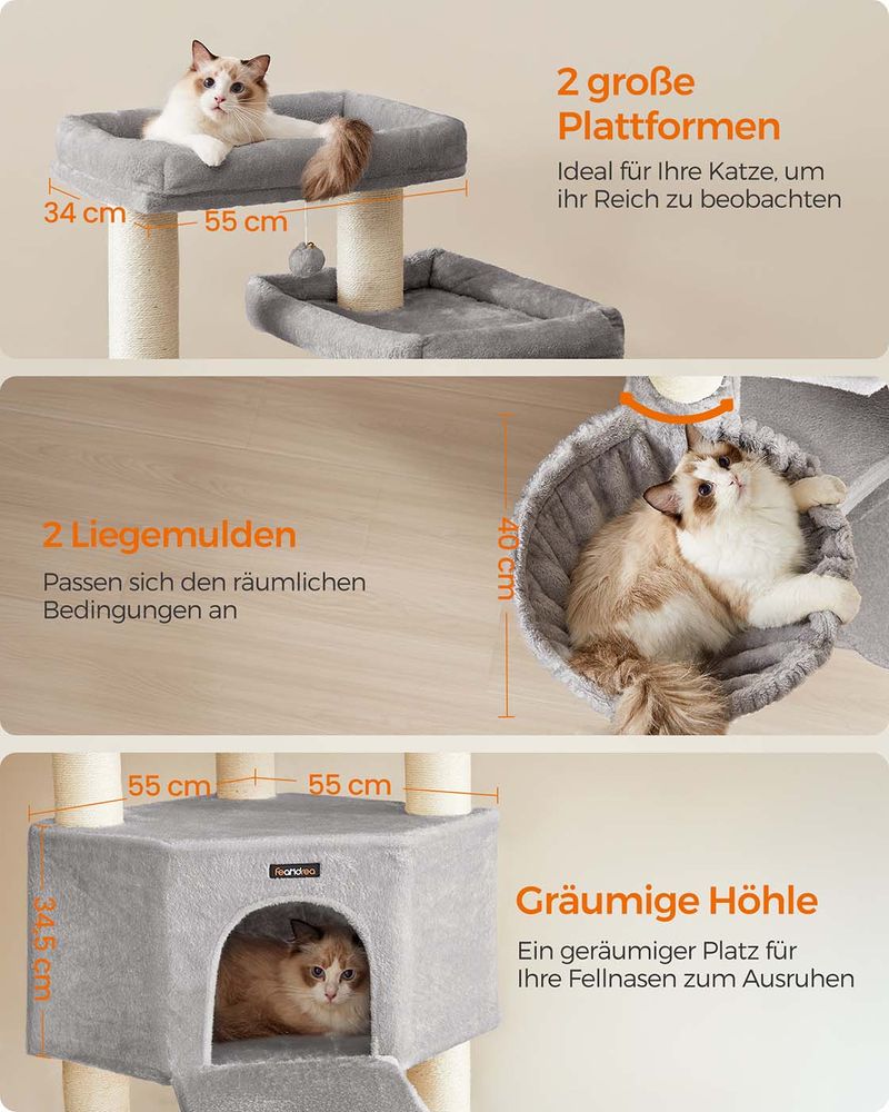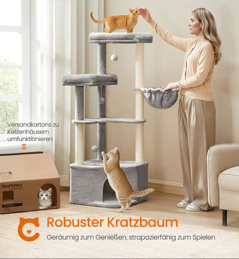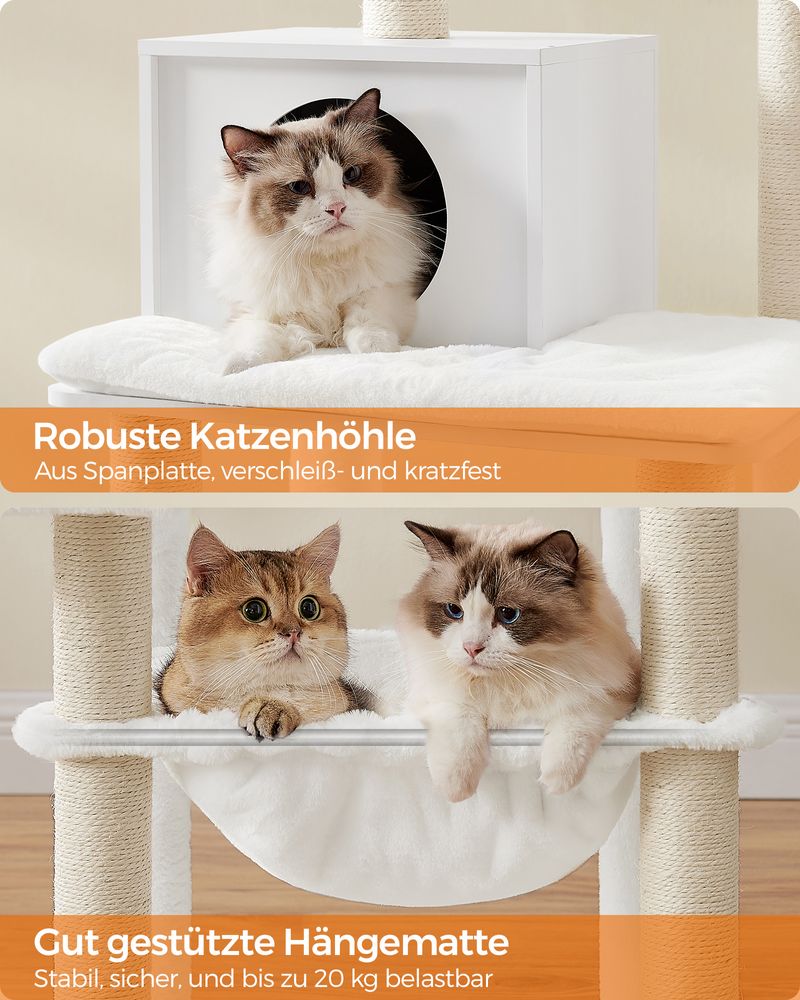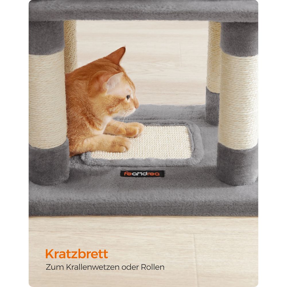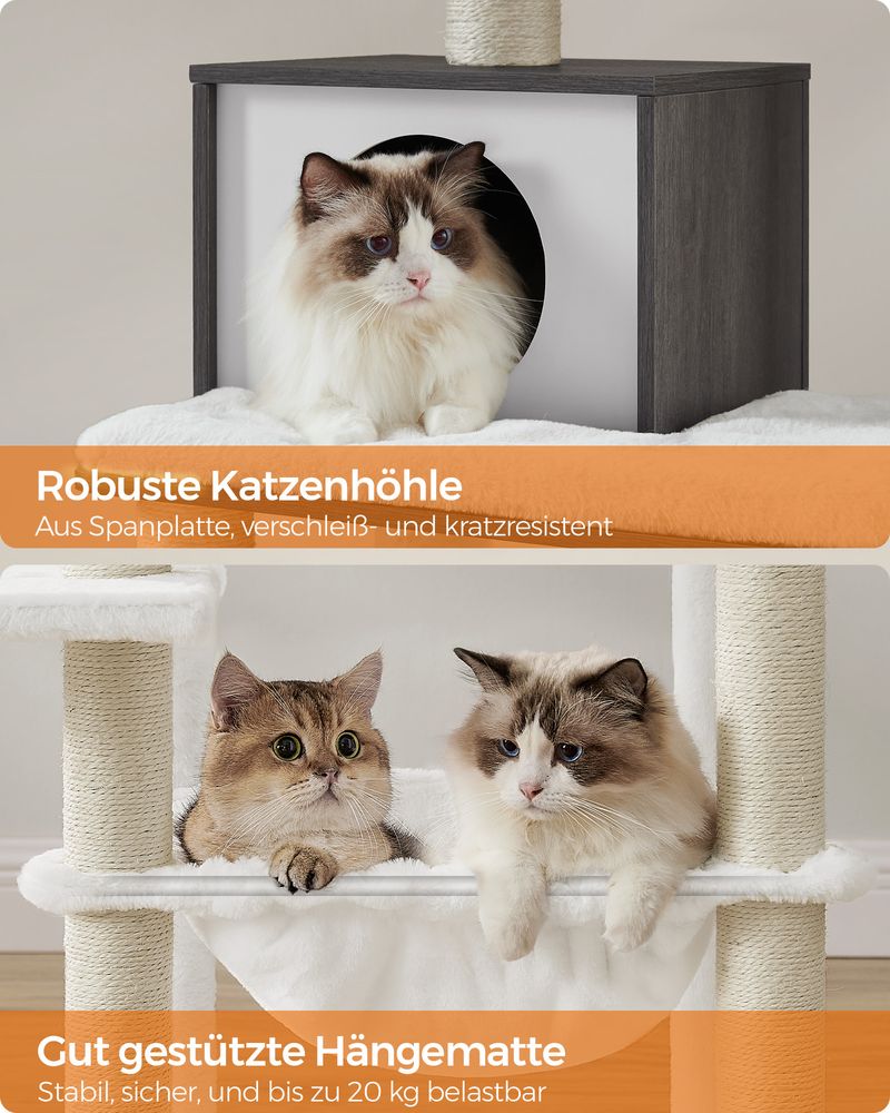 Katzenkratzbaum mit Hängematte und Katzenhaus – Modernes Design in Grau und Weiß – Komfortables und langlebiges Spielparadies