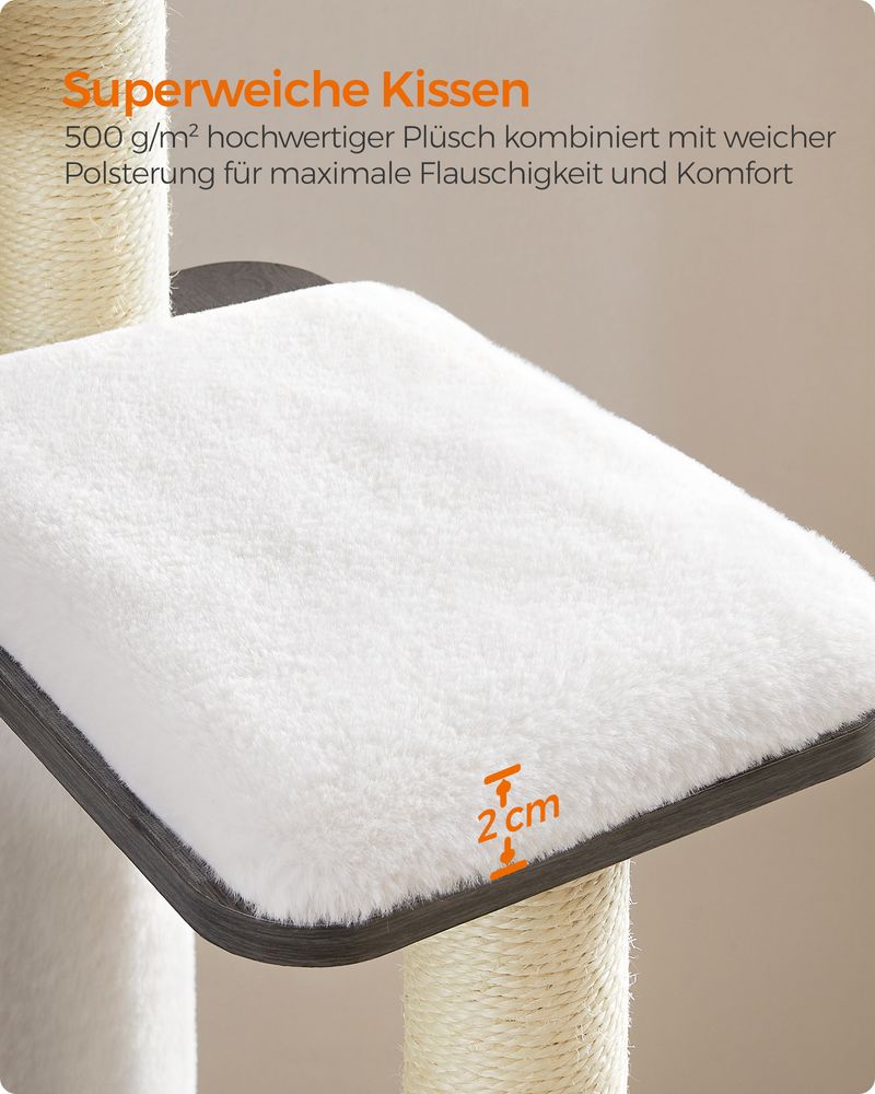 Die drei 2 cm dicken Kissen sind üppig gefüllt und mit extra dichtem 500 g/m² Plüsch bezogen – weicher und voluminöser als herkömmliche Stoffe. Dies bietet Ihren Katzen einen wunderbar warmen und bequemen Ruheplatz.