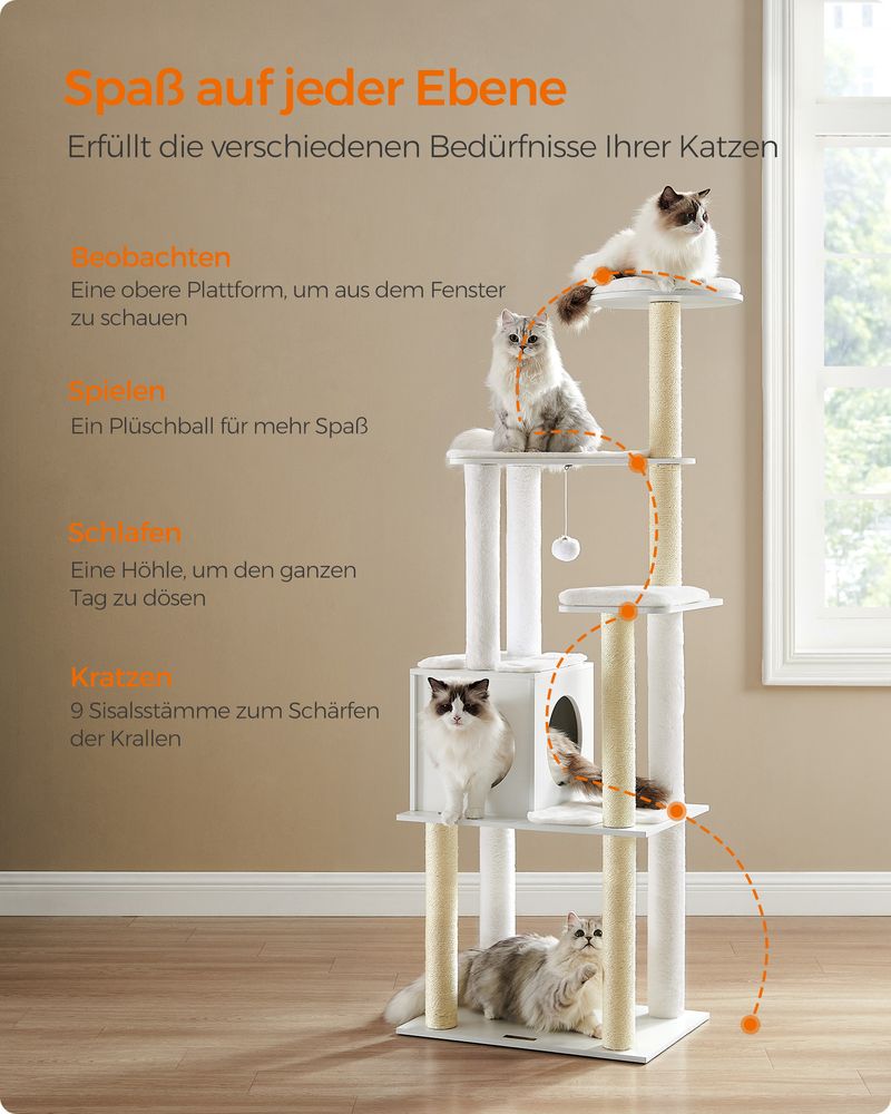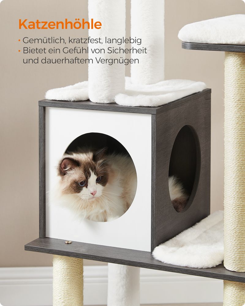 Mit mehreren Ebenen und Spielmöglichkeiten nutzt dieser Kratzbaum seine Höhe optimal aus. Ideal für Haushalte mit mehreren Katzen, die gerne klettern, sich ausruhen oder von ihrem eigenen Thron aus alles im Blick behalten.