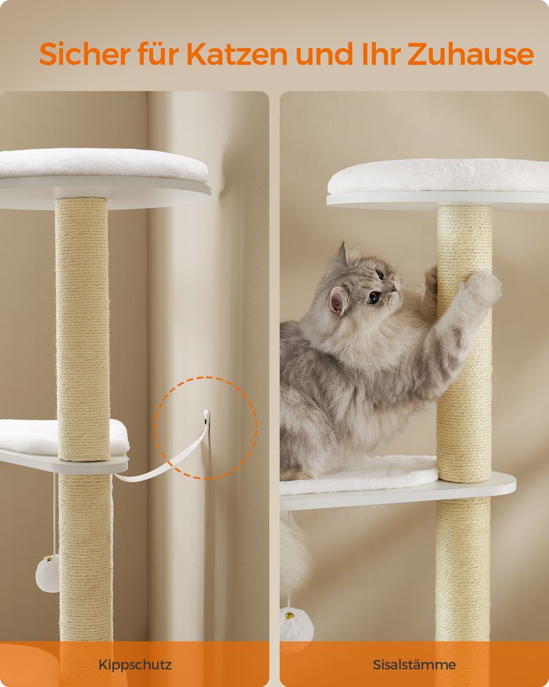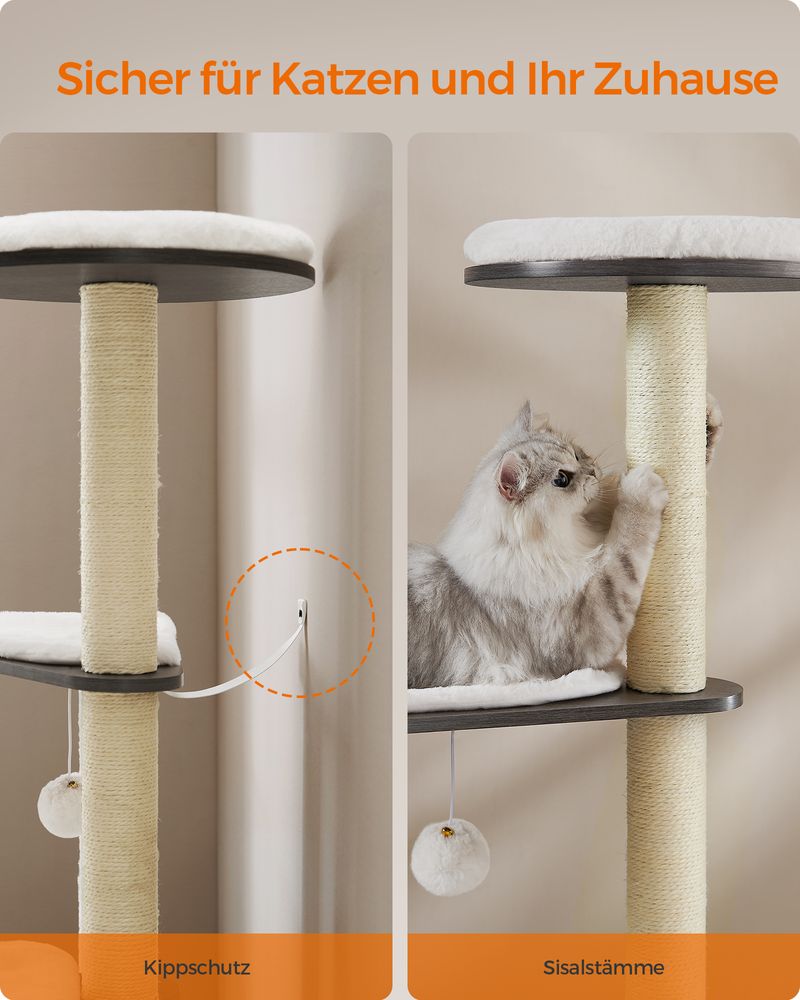 Dank der stabilen Spanplattenkonstruktion, des dicken Sockels mit Antirutschpads und des integrierten Kippschutzes bietet dieser Kratzbaum maximale Sicherheit, selbst für größere Katzen.