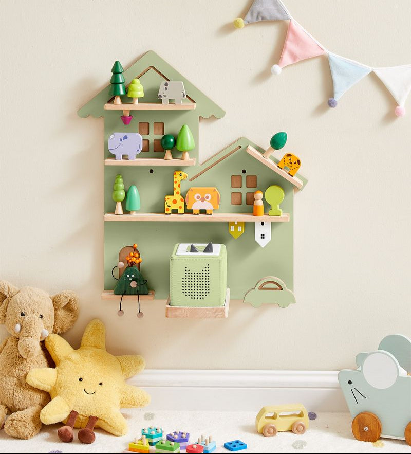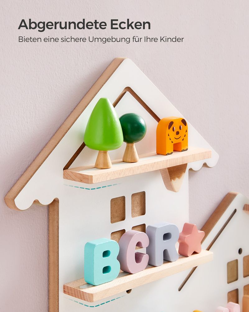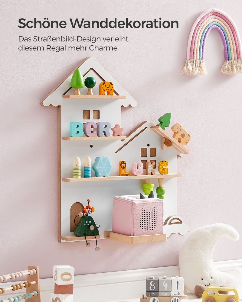 Wandregal für Toniebox und Figuren - Straßendesign - Mit magnetischen Ablagen aus Buchenholz - Inklusive Kabelhalter - 55,6 cm breit