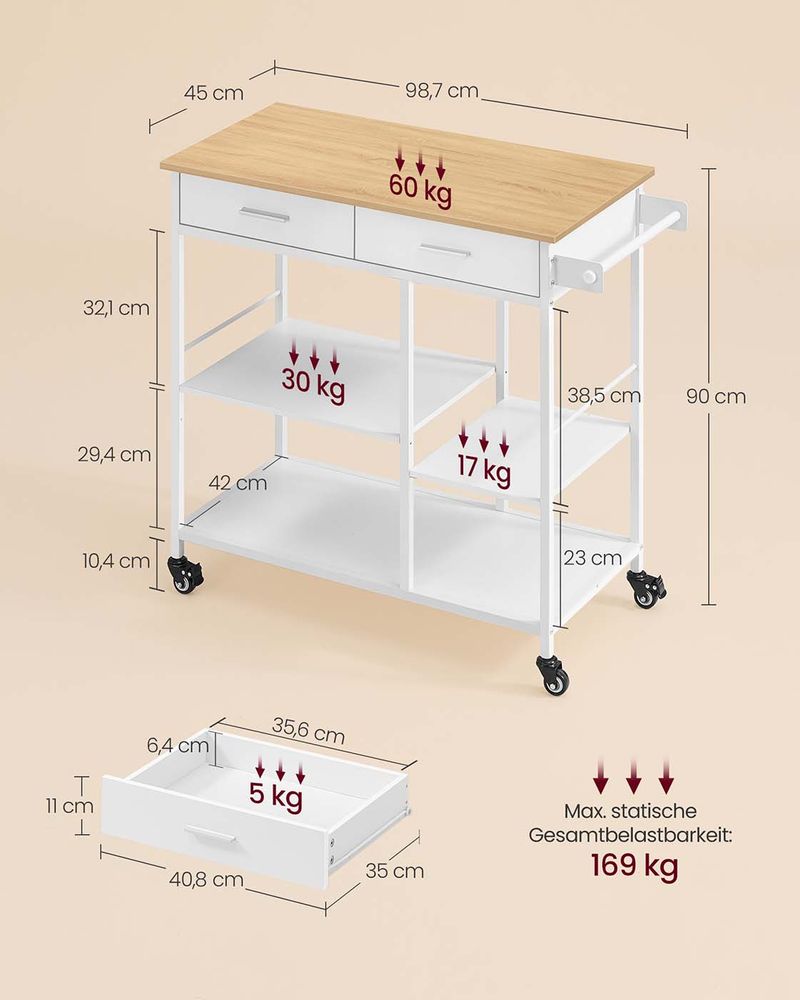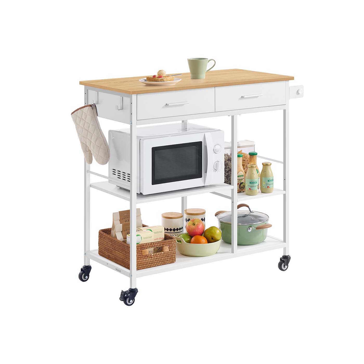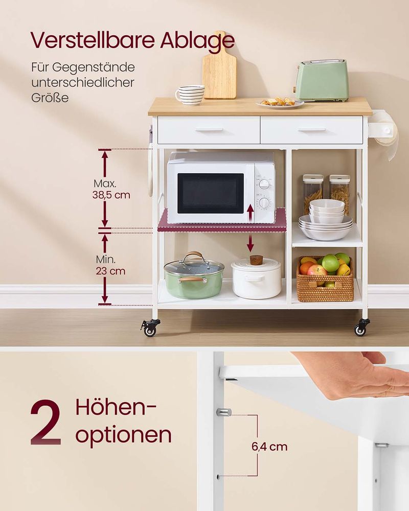 Mobiler Küchenwagen mit Schublade und Ablagen – Beweglich und abschließbar – Ideal für kleine Küchen – Modernes Eichen-Weiß-Finish