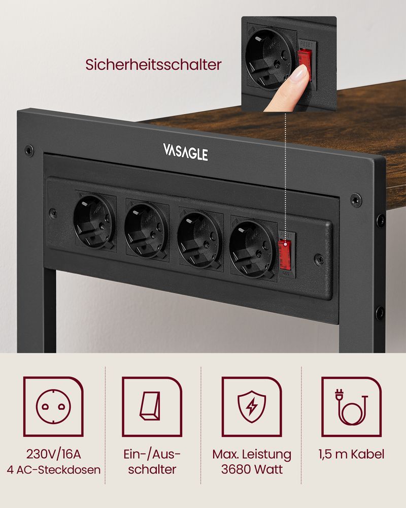 Die integrierte Steckdosenleiste mit 4 Steckdosen kann links oder rechts montiert werden. So können Sie Ihre Geräte bequem und genau dort aufladen, wo Sie sie brauchen.