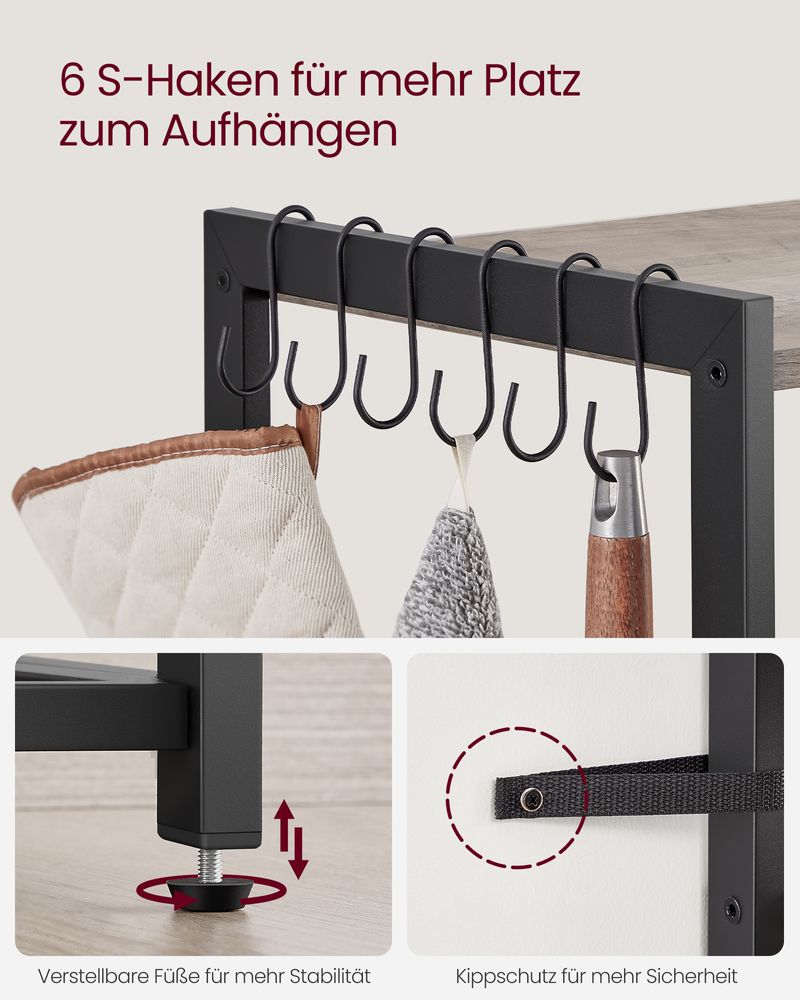 Ausgestattet mit mehreren Ablagen für Geschirr und Vorräte, zwei 9 cm tiefen Gitterkörben für Obst und Gemüse und sechs praktischen Haken für Utensilien. Alles, was Sie zum Kochen brauchen, ist griffbereit.