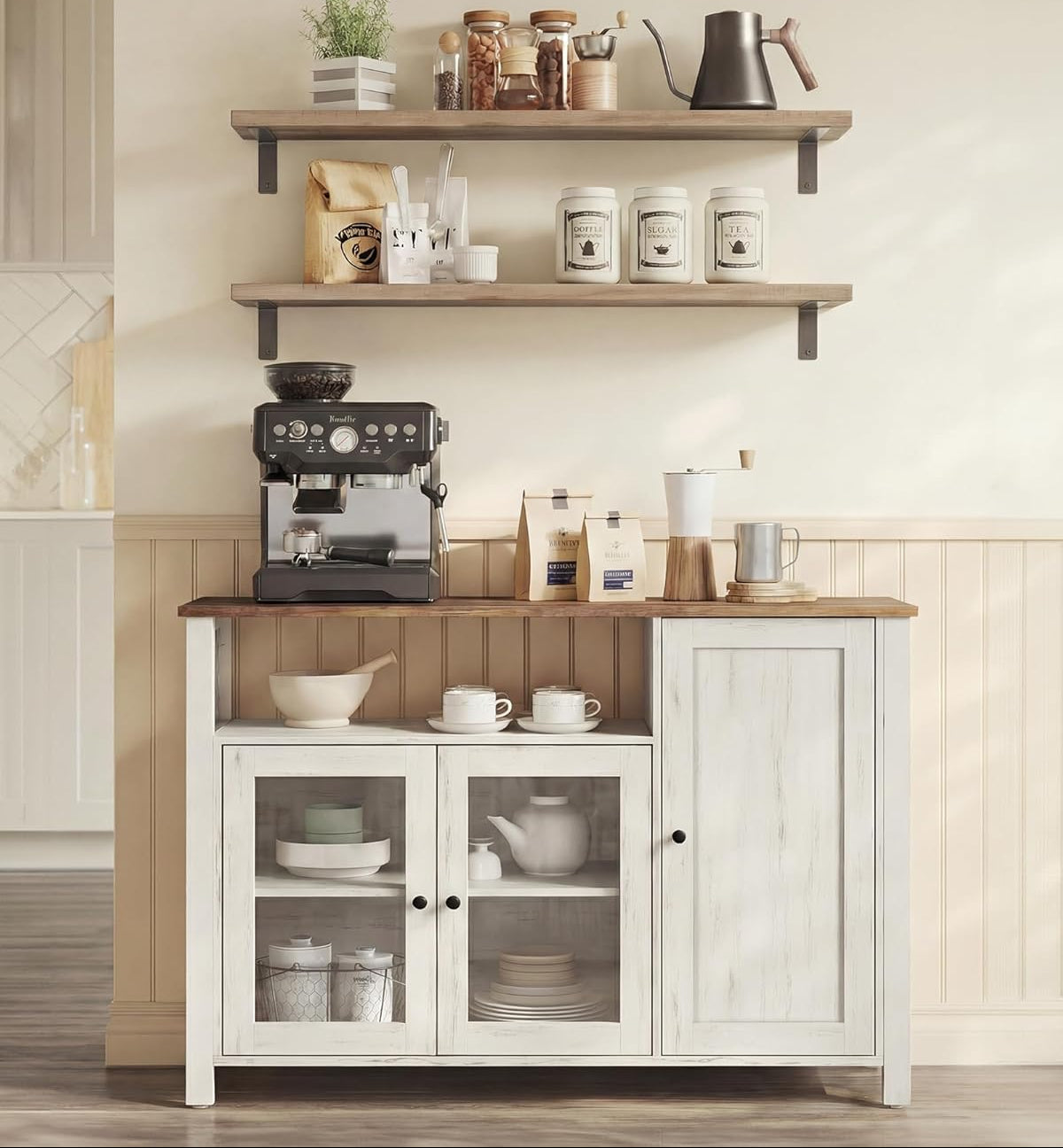 Die linken und rechten Schränke sind mit verstellbaren Einlegeböden ausgestattet, sodass Sie größere oder kleinere Gegenstände problemlos verstauen können. Dank der transparenten Türen haben Sie alles auf einen Blick – praktisch und stilvoll.