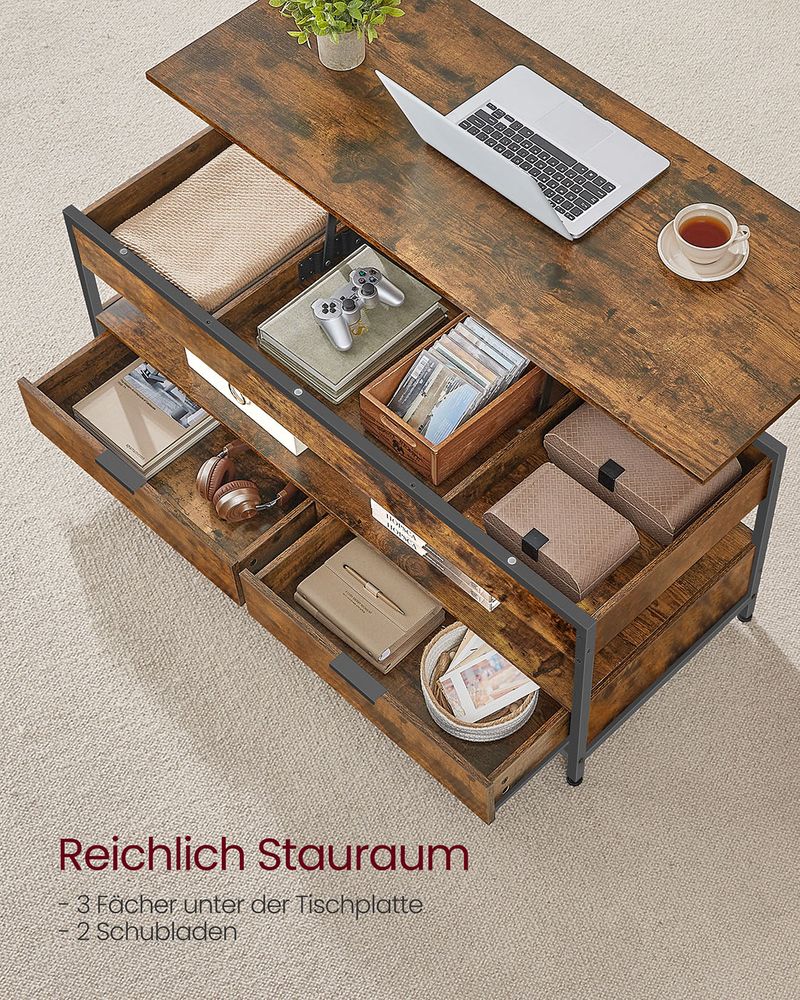 Verstellbarer Couchtisch im Industriestil mit anhebbarer Platte – 120 x 50 cm – Mit Schubladen und verstecktem Stauraum