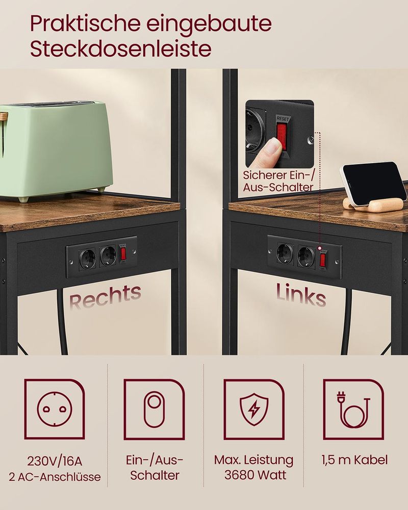 Ausgestattet mit einer integrierten Steckdosenleiste mit zwei Ausgängen, ideal für den Anschluss von Mikrowelle, Mixer oder Kaffeemaschine. Der Schalter und der Überlastungsschutz sorgen für zusätzliche Sicherheit im täglichen Gebrauch.