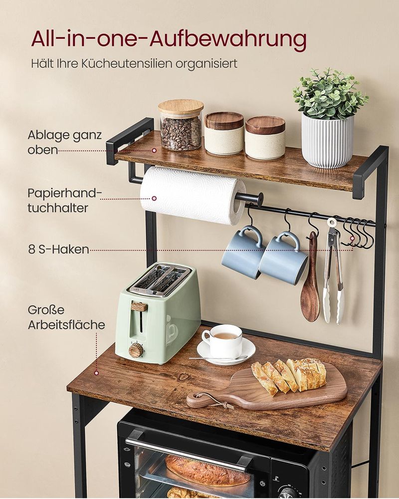 Dank seines cleveren Designs benötigt dieses Küchenregal nur wenig Stellfläche und bietet dennoch ausreichend Platz für Geräte, Kochgeschirr und Vorräte. Ideal für kleinere Küchen oder Studios.