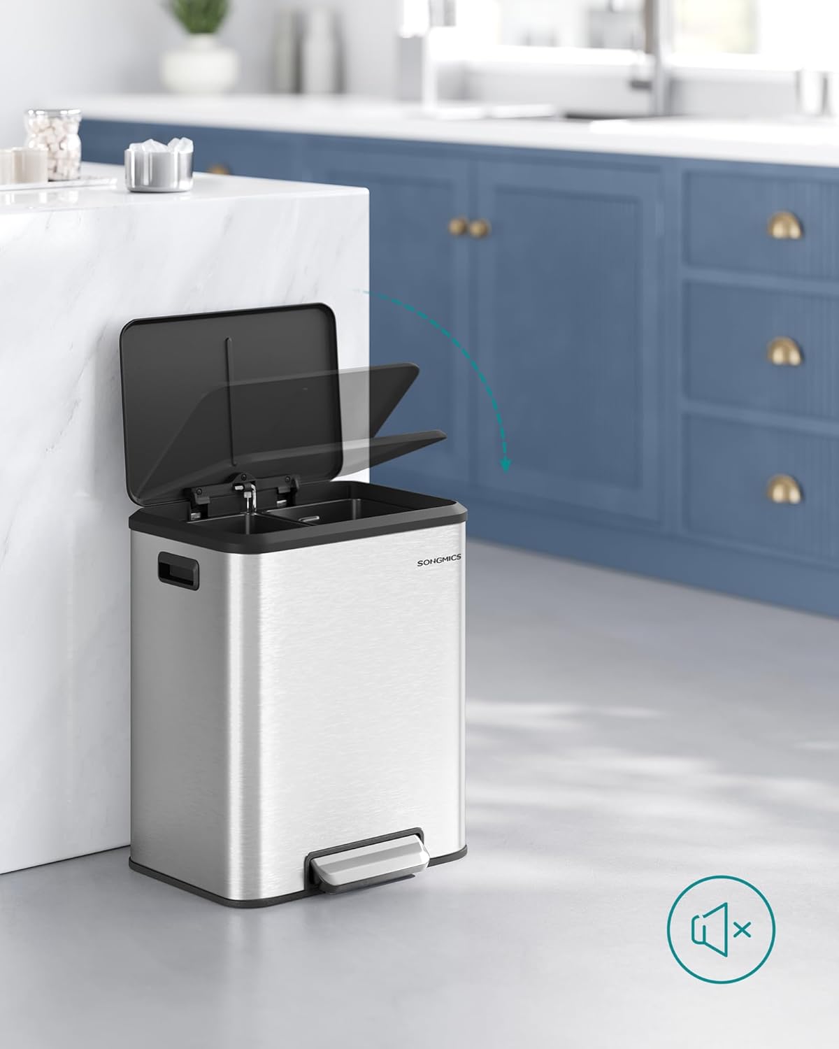 Dank der zwei 15-Liter-Fächer ist die Mülltrennung in der Küche ein Kinderspiel. Nutzen Sie ein Fach für Restmüll und das andere für Wertstoffe – immer geordnet und hygienisch.