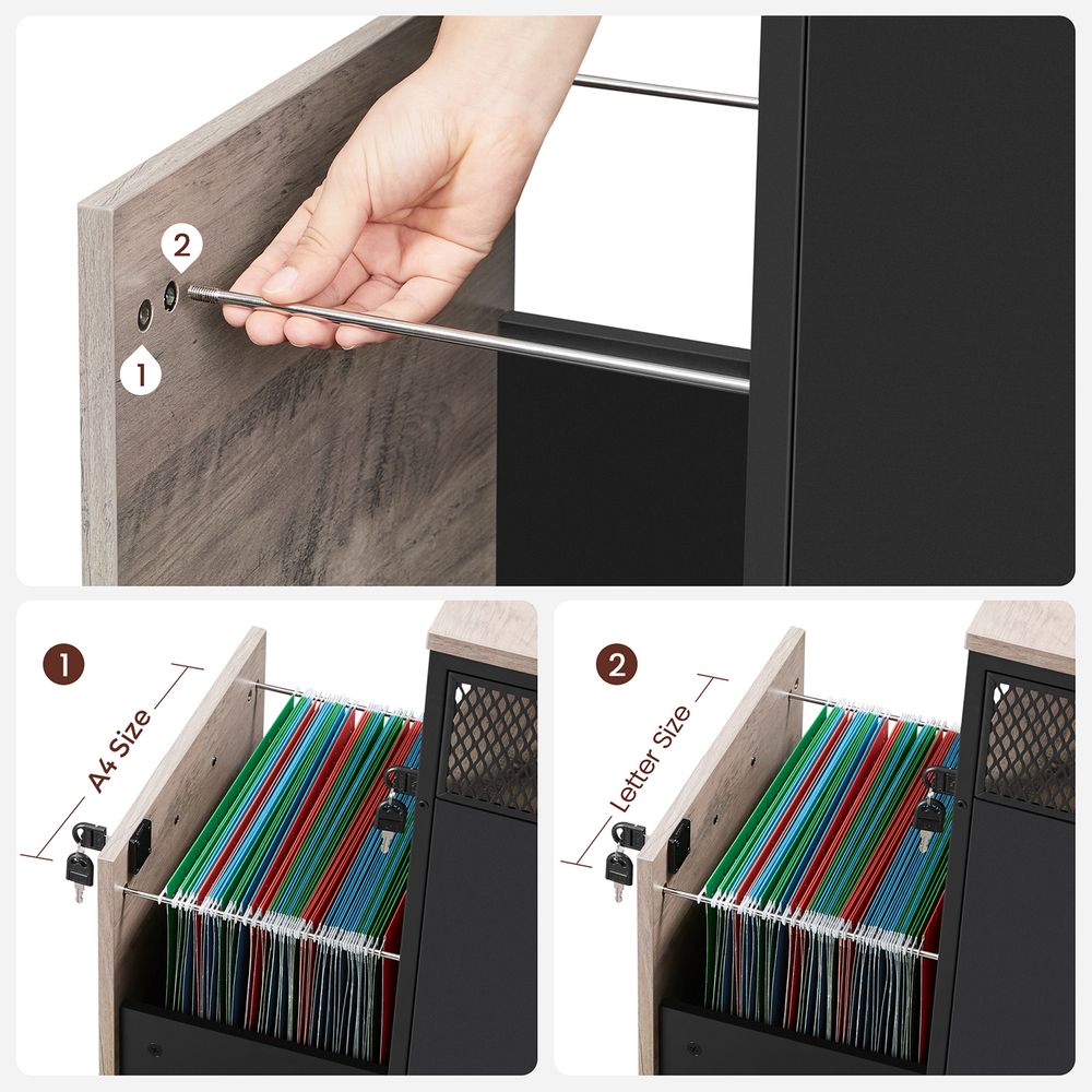 Notizblöcke im offenen Fach, Stifte in der oberen Schublade und wichtige Dokumente im A4- oder Letter-Format übersichtlich in der unteren Hängeregistraturschublade – dieser Aktenschrank bringt Ordnung in Ihren Arbeitsplatz. Das obere Fach bietet zusätzlichen Platz für Dekorationen oder Büromaterial.