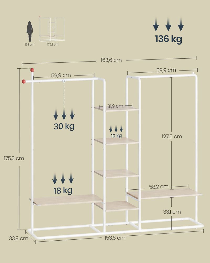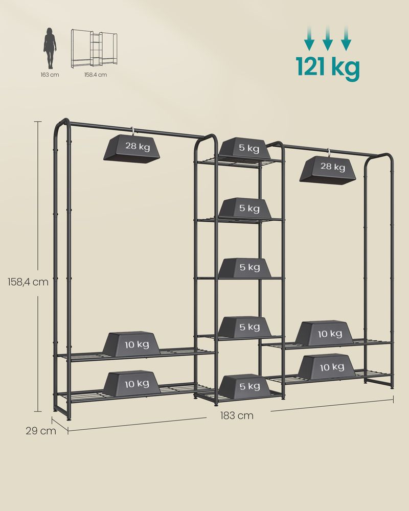 Offener Kleiderständer mit Kleiderhaken – Industrieller Kleiderständer mit Ablagen – 2 Kleiderstangen – Bis 136 kg belastbar