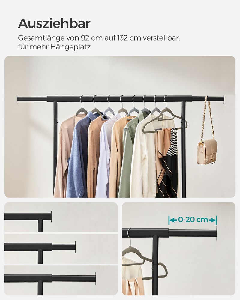 Die Kleiderstange ist von 92 bis 132 cm Breite verstellbar und bietet viel Platz für Kleidung, Mäntel, Taschen und Hüte. Die untere Ablage bietet Platz für zusätzliche Aufbewahrungsboxen.