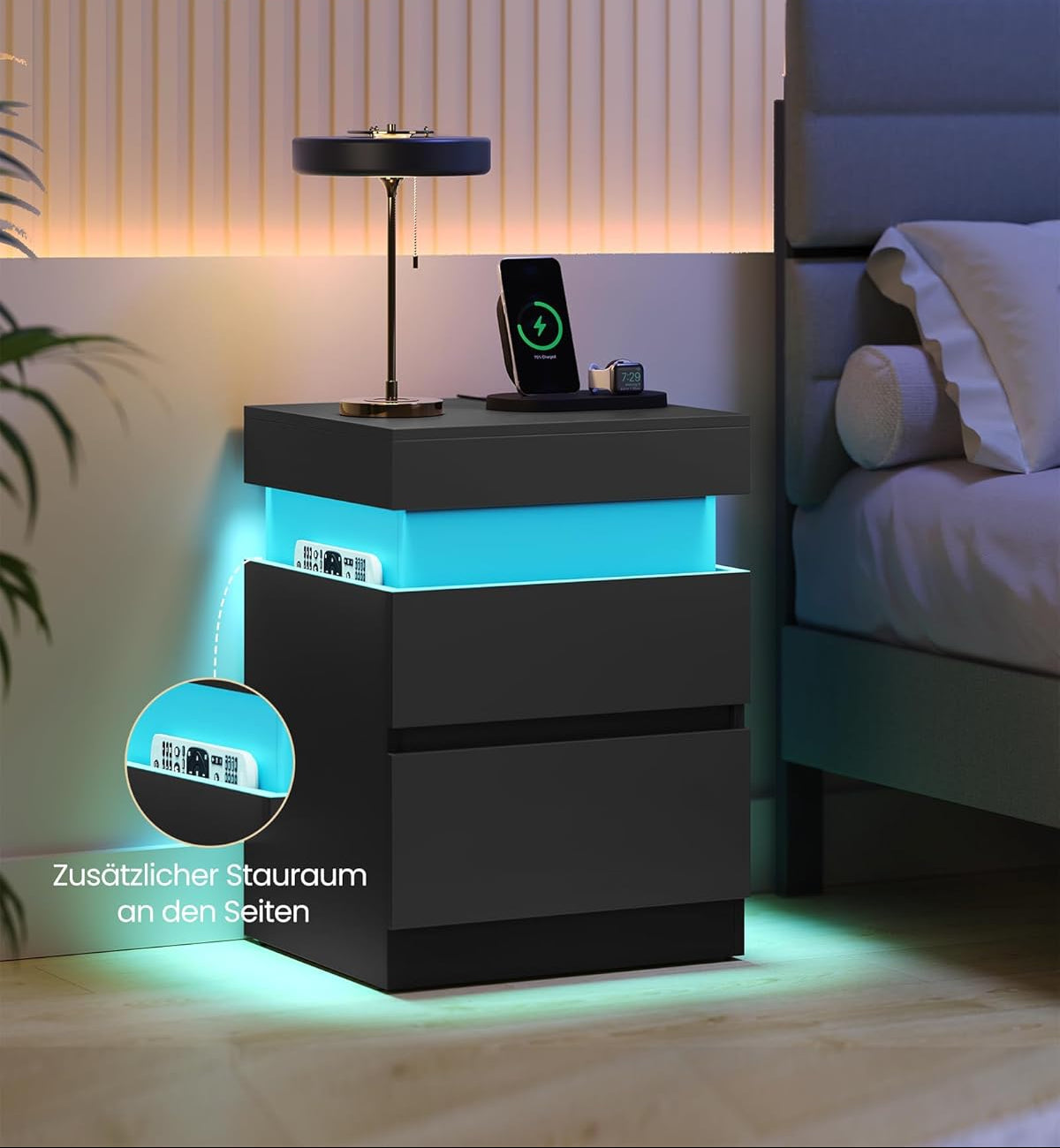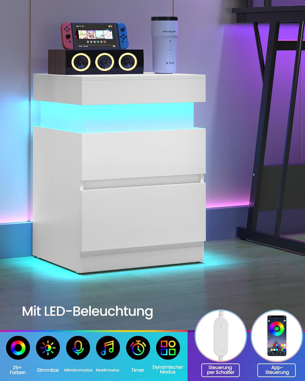 Die integrierte LED-Beleuchtung mit über 29 Farben erzeugt ein stilvolles, schwebendes Licht unter dem Schrank. Sie können die Beleuchtung bequem per App steuern und aus verschiedenen Modi, Farben und Lichteffekten wählen, um eine entspannende Atmosphäre in Ihrem Schlafzimmer zu schaffen.