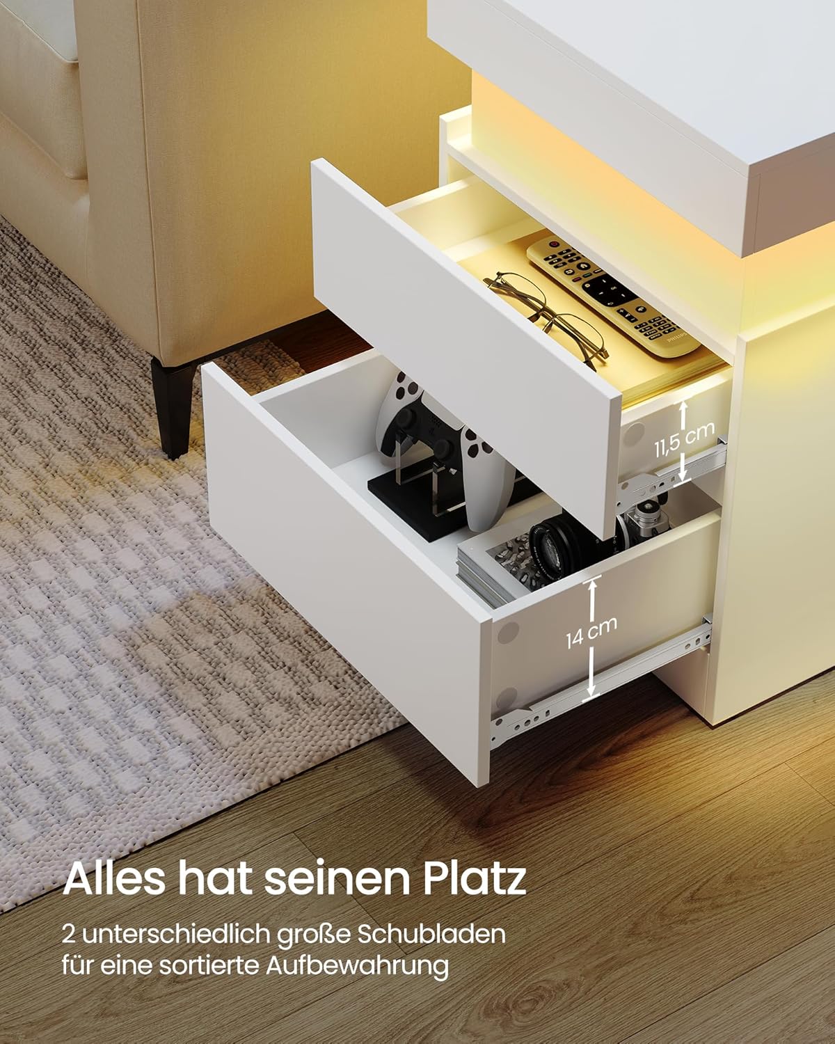 Die 2 Schubladen mit unterschiedlichen Höhen (14 cm und 11,5 cm) bieten Platz für Zubehör, Ladegeräte und kleine Utensilien. Dank der seitlichen Fächer haben Sie Ihr Smartphone oder Ihre Fernbedienung immer griffbereit.