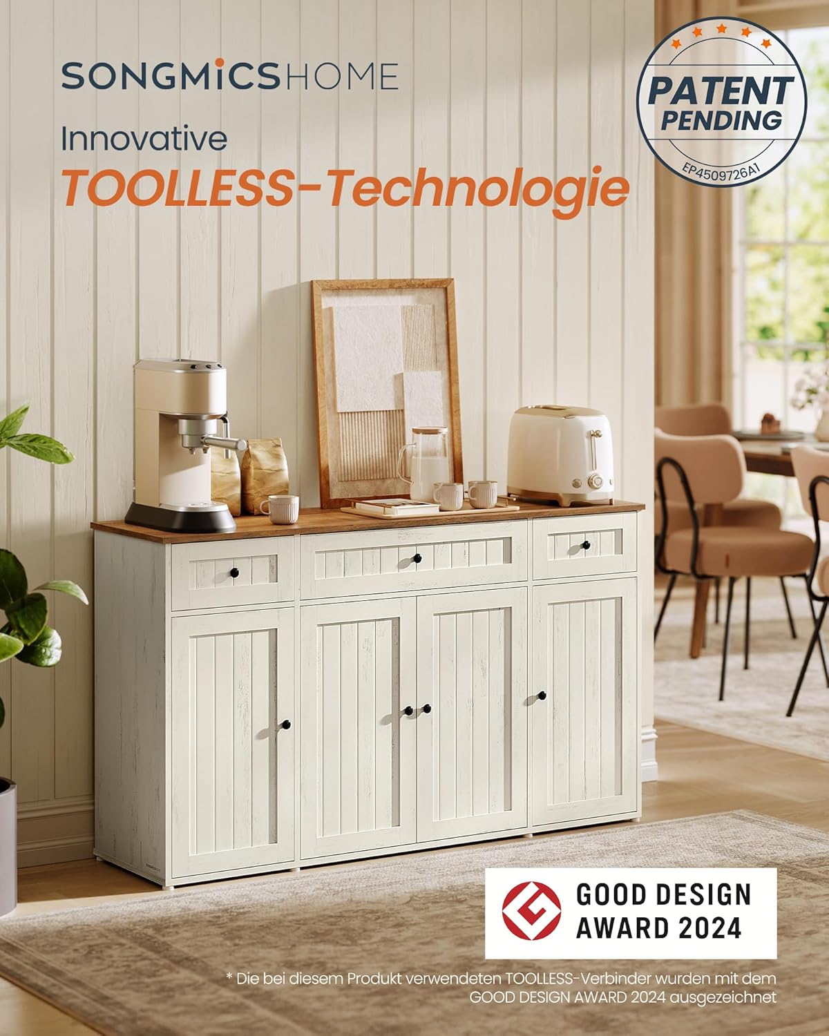 Dank der innovativen werkzeuglosen Technologie lässt sich dieses Sideboard in nur 15 Minuten aufbauen. Die mit dem Good Design Award 2024 ausgezeichneten Verbindungsstücke ermöglichen ein einfaches Zusammenklicken der Paneele – ganz ohne Schrauben oder Werkzeug.