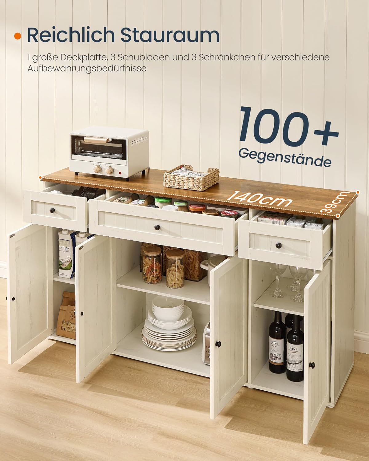 Mit den Maßen 140 × 39 × 81,3 cm bietet dieses Sideboard großzügigen Stauraum. Die 140 cm breite Ablagefläche ist ideal für Kaffeemaschine oder Mikrowelle, während die 3 Schubladen und 3 Schranktüren viel Platz für Geschirr, Besteck oder andere Utensilien bieten.