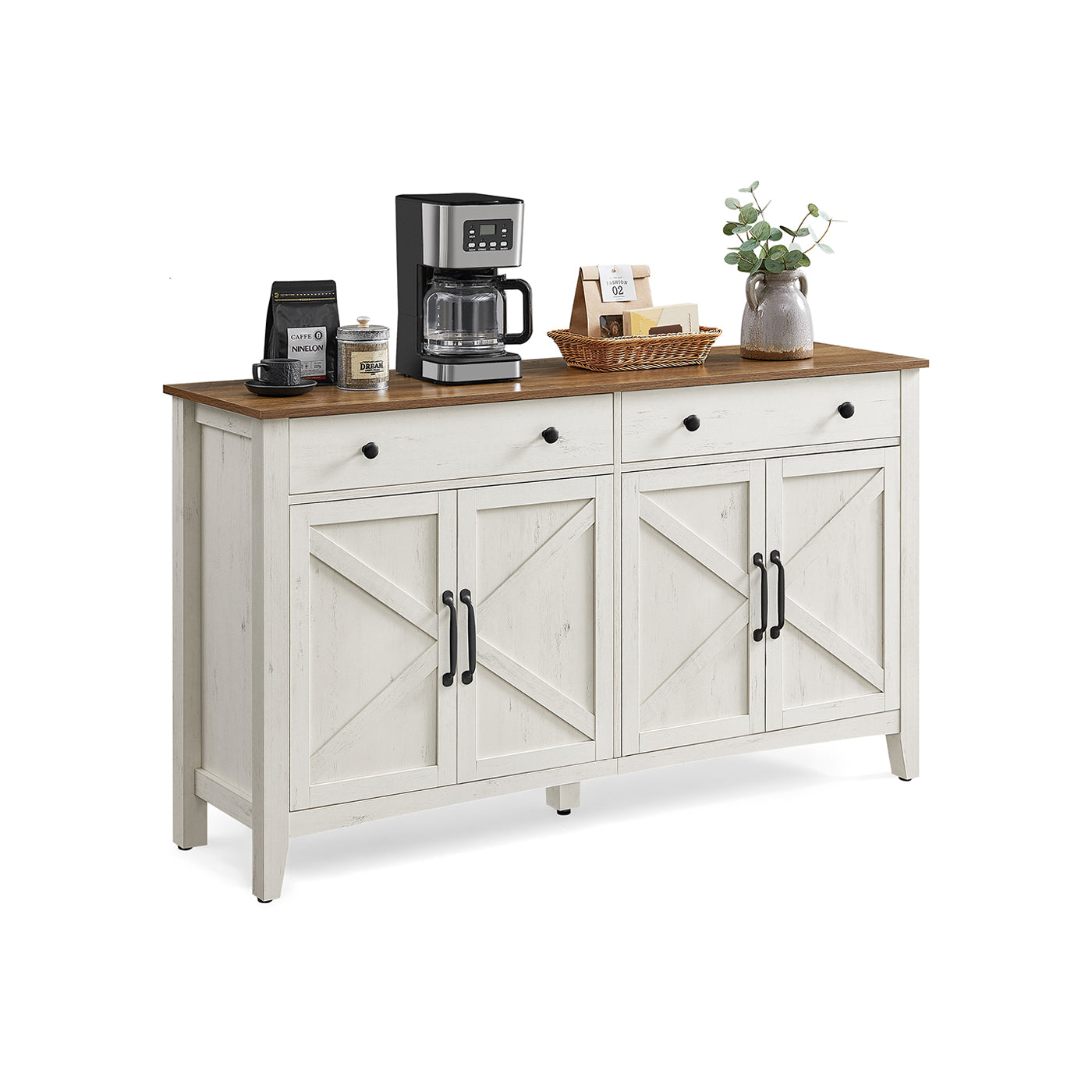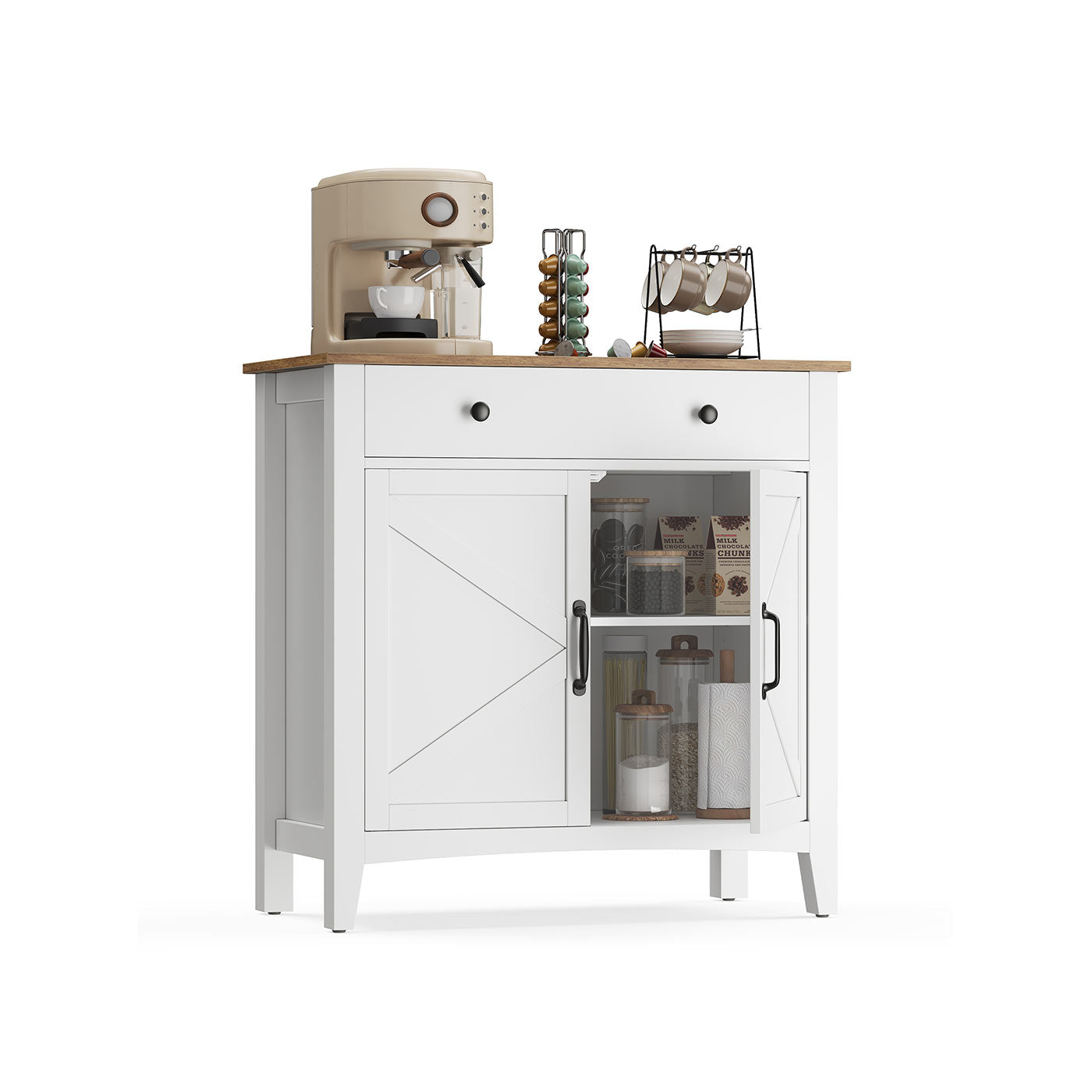Die Oberseite bietet Platz für Dekorationen oder Geschirr, während die geräumige Schublade perfekt für kleine Gegenstände wie Schlüssel, Besteck oder Ladegeräte ist. Der Unterschrank bietet versteckten Stauraum für größere Gegenstände, von Vorräten bis hin zu Geschirr.
