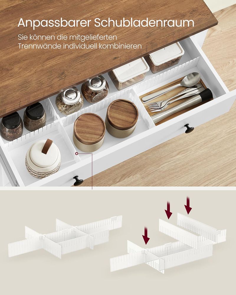 Die Schublade verfügt über verstellbare Trennwände für eine individuelle Einteilung. Der Unterschrank verfügt über 5-fach höhenverstellbare Einlegeböden, sodass Sie problemlos Platz für Gegenstände unterschiedlicher Größe schaffen können.