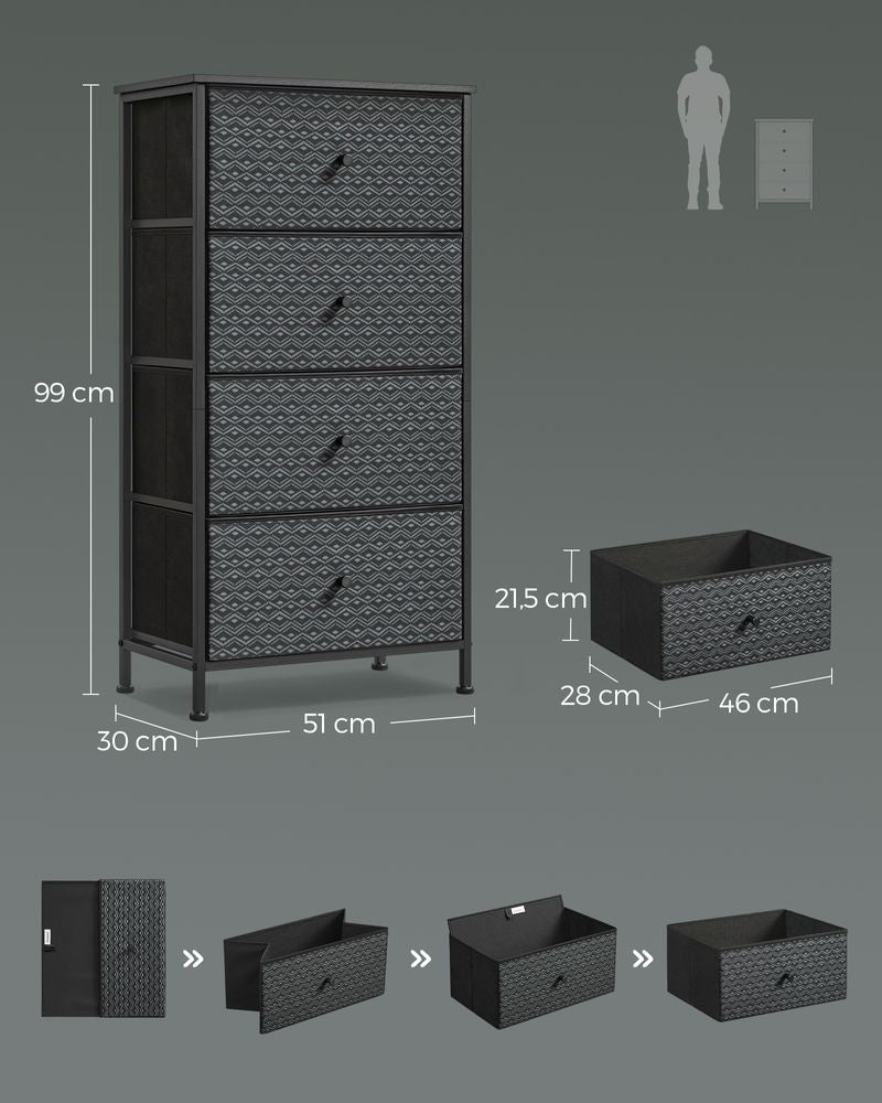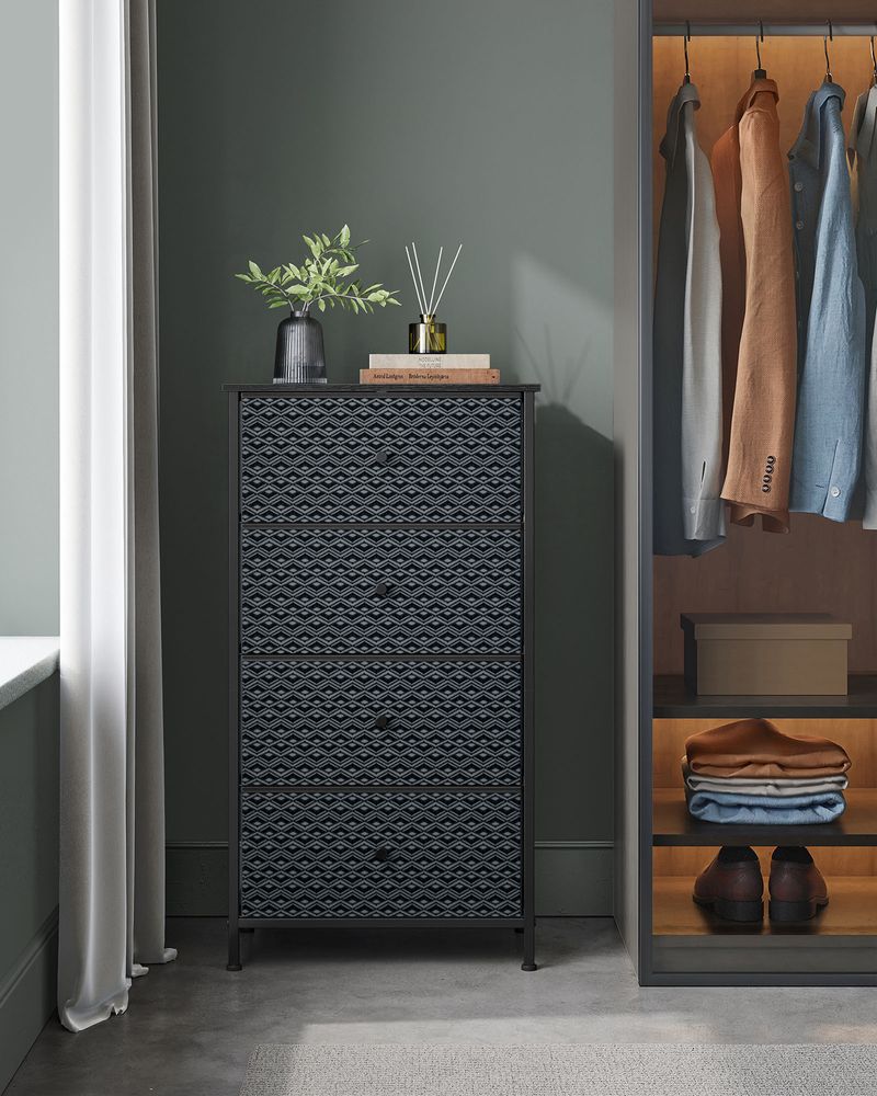 Schwarz-weiße Kommode – Aufbewahrungsschrank mit 5 Stoffschubladen – Geometrisches Design – Metallrahmen – 99 cm hoch – Bis zu 63,5 kg belastbar