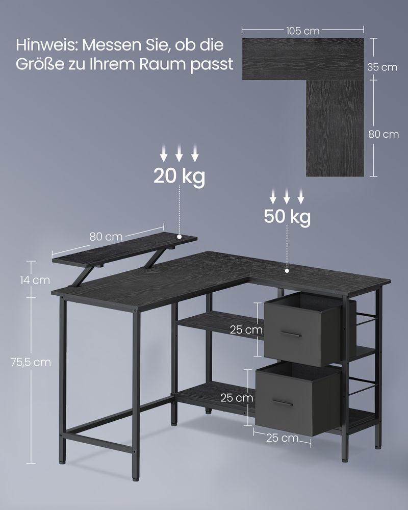 L-förmiger Schreibtisch mit Monitorständer – Eckschreibtisch mit 2 Schubladen und verstellbarem Regal – 135 x 105 x 89,5 cm