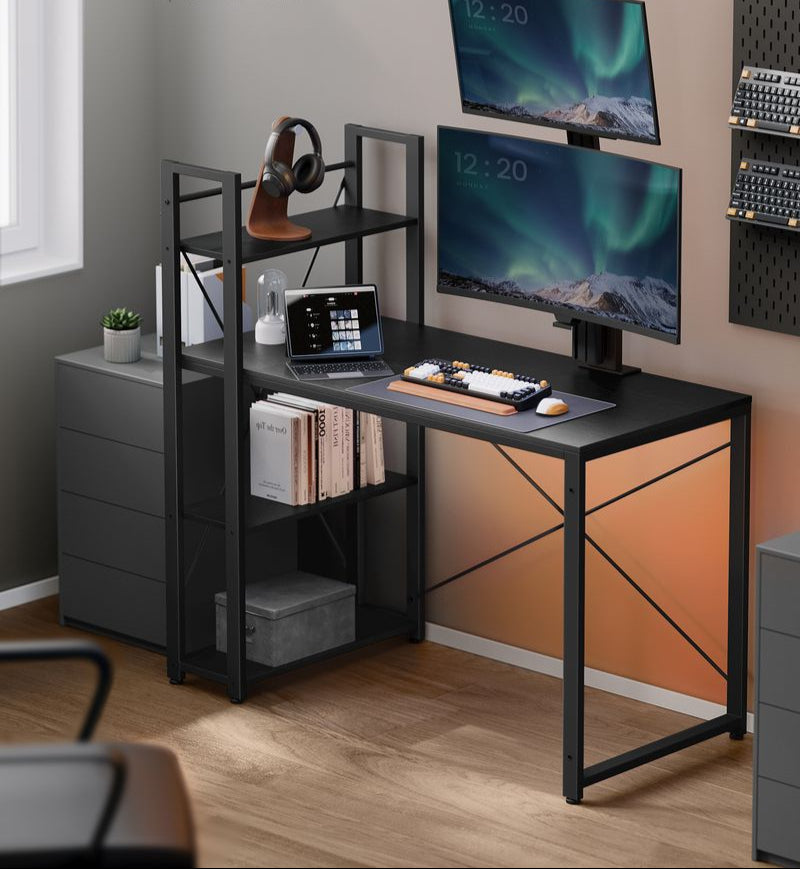 Schreibtisch mit Bücherregal – 120 cm breit – Flexible Regalmontage links oder rechts – Industriedesign – Bis zu 100 kg belastbar
