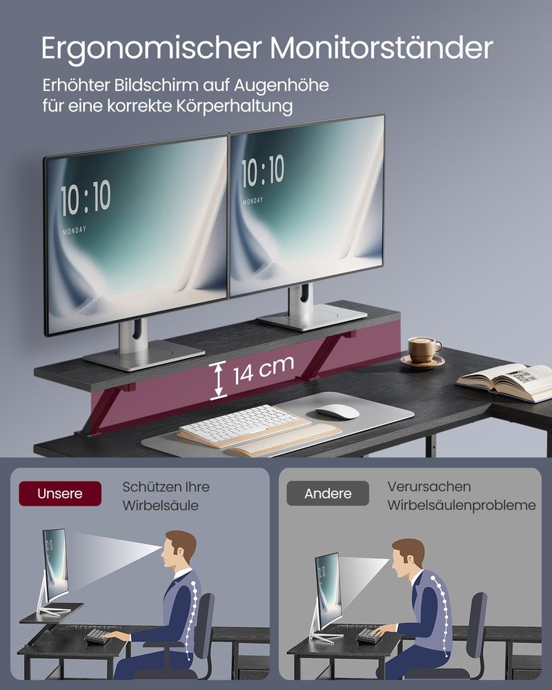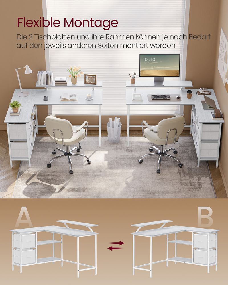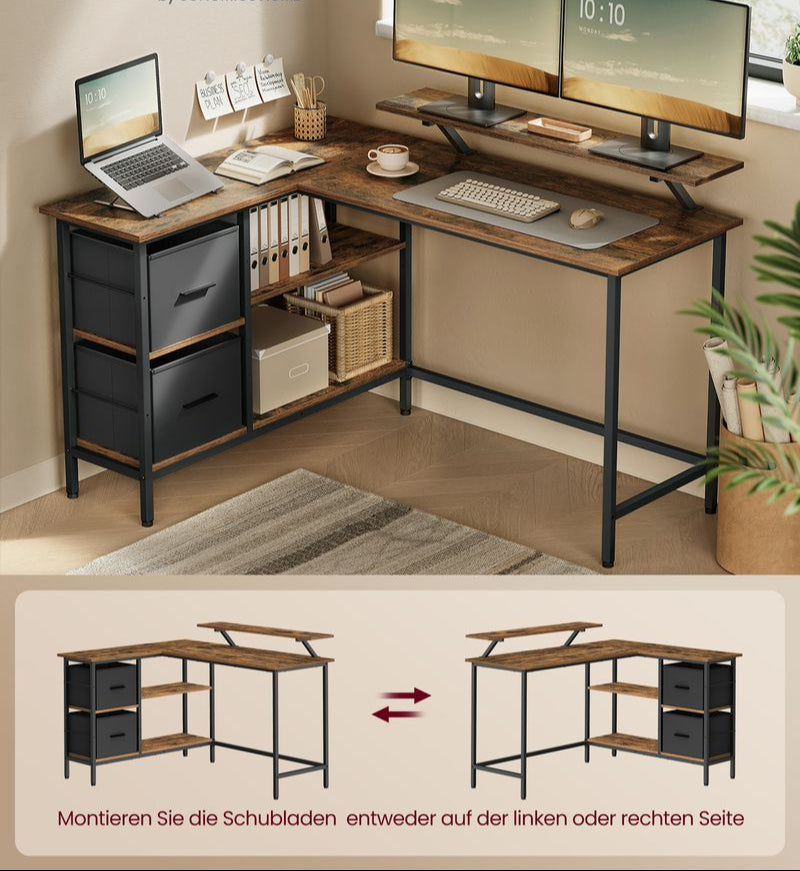 L-förmiger Schreibtisch mit Monitorständer – Eckschreibtisch mit 2 Schubladen und verstellbarem Regal – 135 x 105 x 89,5 cm